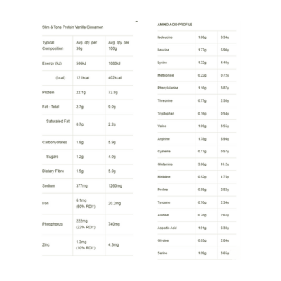 {"id":10005570814248,"title":"Amazonia Raw Protein Slim \u0026 Tone Vanilla Cinnamon 500g","handle":"amazonia-raw-protein-slim-tone-vanilla-cinnamon-500g","description":"\u003cp\u003e\u003cspan\u003eDesigned to support a healthy metabolism, minimise cravings, tone muscle and support weight management.\u003c\/span\u003e\u003c\/p\u003e\n\u003ch5\u003eReviews\u003c\/h5\u003e\n\u003cp\u003eReviews go here\u003c\/p\u003e\n\u003ch5\u003eIngredients\u003c\/h5\u003e\n\u003cp\u003eAny images, tags, filters, product categories, and any other information on this website showing ingredients, nutrition panels, or allergy statements are for guidance only, as manufacturers often change their formulations without notice. Please contact the manufacturer for the most up-to-date ingredient information, or email us to confirm the ingredients of the stock currently on hand.\u003c\/p\u003e","published_at":"2025-11-21T10:12:53+11:00","created_at":"2025-11-21T10:12:53+11:00","vendor":"Amazonia","type":"","tags":["Protein Powders","Sydney Store"],"price":4390,"price_min":4390,"price_max":4390,"available":true,"price_varies":false,"compare_at_price":null,"compare_at_price_min":0,"compare_at_price_max":0,"compare_at_price_varies":false,"variants":[{"id":51075556639016,"title":"Default Title","option1":"Default Title","option2":null,"option3":null,"sku":"9344060000626","requires_shipping":true,"taxable":true,"featured_image":null,"available":true,"name":"Amazonia Raw Protein Slim \u0026 Tone Vanilla Cinnamon 500g","public_title":null,"options":["Default Title"],"price":4390,"weight":0,"compare_at_price":null,"inventory_quantity":3,"inventory_management":"shopify","inventory_policy":"deny","barcode":null,"requires_selling_plan":false,"selling_plan_allocations":[]}],"images":["\/\/www.vegangrocerystore.com.au\/cdn\/shop\/files\/ProteinSlim_ToneVanillaCinnamon500g.png?v=1763789743","\/\/www.vegangrocerystore.com.au\/cdn\/shop\/files\/RAWslimtone-NutritionalInfo.png?v=1764196493","\/\/www.vegangrocerystore.com.au\/cdn\/shop\/files\/RAWslimtone-Ingredients.png?v=1764196493"],"featured_image":"\/\/www.vegangrocerystore.com.au\/cdn\/shop\/files\/ProteinSlim_ToneVanillaCinnamon500g.png?v=1763789743","options":["Title"],"media":[{"alt":null,"id":43028679393576,"position":1,"preview_image":{"aspect_ratio":1.0,"height":400,"width":400,"src":"\/\/www.vegangrocerystore.com.au\/cdn\/shop\/files\/ProteinSlim_ToneVanillaCinnamon500g.png?v=1763789743"},"aspect_ratio":1.0,"height":400,"media_type":"image","src":"\/\/www.vegangrocerystore.com.au\/cdn\/shop\/files\/ProteinSlim_ToneVanillaCinnamon500g.png?v=1763789743","width":400},{"alt":null,"id":43090700042536,"position":2,"preview_image":{"aspect_ratio":1.0,"height":400,"width":400,"src":"\/\/www.vegangrocerystore.com.au\/cdn\/shop\/files\/RAWslimtone-NutritionalInfo.png?v=1764196493"},"aspect_ratio":1.0,"height":400,"media_type":"image","src":"\/\/www.vegangrocerystore.com.au\/cdn\/shop\/files\/RAWslimtone-NutritionalInfo.png?v=1764196493","width":400},{"alt":null,"id":43090700075304,"position":3,"preview_image":{"aspect_ratio":1.0,"height":400,"width":400,"src":"\/\/www.vegangrocerystore.com.au\/cdn\/shop\/files\/RAWslimtone-Ingredients.png?v=1764196493"},"aspect_ratio":1.0,"height":400,"media_type":"image","src":"\/\/www.vegangrocerystore.com.au\/cdn\/shop\/files\/RAWslimtone-Ingredients.png?v=1764196493","width":400}],"requires_selling_plan":false,"selling_plan_groups":[],"content":"\u003cp\u003e\u003cspan\u003eDesigned to support a healthy metabolism, minimise cravings, tone muscle and support weight management.\u003c\/span\u003e\u003c\/p\u003e\n\u003ch5\u003eReviews\u003c\/h5\u003e\n\u003cp\u003eReviews go here\u003c\/p\u003e\n\u003ch5\u003eIngredients\u003c\/h5\u003e\n\u003cp\u003eAny images, tags, filters, product categories, and any other information on this website showing ingredients, nutrition panels, or allergy statements are for guidance only, as manufacturers often change their formulations without notice. Please contact the manufacturer for the most up-to-date ingredient information, or email us to confirm the ingredients of the stock currently on hand.\u003c\/p\u003e"}