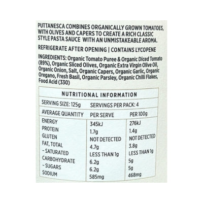 {"id":9488101736744,"title":"Aurelio Pasta Sauce - Puttanesca Organic 500g","handle":"aurelio-pasta-sauce-puttanesca-organic-500g","description":"\u003cp\u003e\u003cspan\u003ePuttanesca combines organically grown tomatoes with olives and capers to create a rich classic style pasta sauce with an unmistakable aroma.\u003c\/span\u003e\u003c\/p\u003e\n\u003ch5\u003eReviews\u003c\/h5\u003e\n\u003cp\u003eReviews go here\u003c\/p\u003e\n\u003ch5\u003eIngredients\u003c\/h5\u003e\n\u003cp\u003eAny images, tags, filters, product categories, and any other information on this website showing ingredients, nutrition panels, or allergy statements are for guidance only, as manufacturers often change their formulations without notice. Please contact the manufacturer for the most up-to-date ingredient information, or email us to confirm the ingredients of the stock currently on hand.\u003c\/p\u003e","published_at":"2025-09-15T16:27:41+10:00","created_at":"2024-11-08T10:09:23+11:00","vendor":"Aurelio","type":"General","tags":["Cooking Sauces","Sydney Store"],"price":582,"price_min":582,"price_max":582,"available":true,"price_varies":false,"compare_at_price":null,"compare_at_price_min":0,"compare_at_price_max":0,"compare_at_price_varies":false,"variants":[{"id":49490749030696,"title":"Default Title","option1":"Default Title","option2":null,"option3":null,"sku":"9326142000816","requires_shipping":true,"taxable":false,"featured_image":null,"available":true,"name":"Aurelio Pasta Sauce - Puttanesca Organic 500g","public_title":null,"options":["Default Title"],"price":582,"weight":0,"compare_at_price":null,"inventory_quantity":2,"inventory_management":"shopify","inventory_policy":"deny","barcode":null,"requires_selling_plan":false,"selling_plan_allocations":[]}],"images":["\/\/www.vegangrocerystore.com.au\/cdn\/shop\/files\/Aurelio_Puttanesca_Organic_500g_2000x2000_8a258f7e-c327-408b-9933-b5024ad67250.jpg?v=1731020963","\/\/www.vegangrocerystore.com.au\/cdn\/shop\/files\/AurelioPuttanesca-NutritionalInformation.jpg?v=1764740010"],"featured_image":"\/\/www.vegangrocerystore.com.au\/cdn\/shop\/files\/Aurelio_Puttanesca_Organic_500g_2000x2000_8a258f7e-c327-408b-9933-b5024ad67250.jpg?v=1731020963","options":["Title"],"media":[{"alt":null,"id":40439967613224,"position":1,"preview_image":{"aspect_ratio":1.0,"height":2000,"width":2000,"src":"\/\/www.vegangrocerystore.com.au\/cdn\/shop\/files\/Aurelio_Puttanesca_Organic_500g_2000x2000_8a258f7e-c327-408b-9933-b5024ad67250.jpg?v=1731020963"},"aspect_ratio":1.0,"height":2000,"media_type":"image","src":"\/\/www.vegangrocerystore.com.au\/cdn\/shop\/files\/Aurelio_Puttanesca_Organic_500g_2000x2000_8a258f7e-c327-408b-9933-b5024ad67250.jpg?v=1731020963","width":2000},{"alt":null,"id":43122748129576,"position":2,"preview_image":{"aspect_ratio":1.0,"height":400,"width":400,"src":"\/\/www.vegangrocerystore.com.au\/cdn\/shop\/files\/AurelioPuttanesca-NutritionalInformation.jpg?v=1764740010"},"aspect_ratio":1.0,"height":400,"media_type":"image","src":"\/\/www.vegangrocerystore.com.au\/cdn\/shop\/files\/AurelioPuttanesca-NutritionalInformation.jpg?v=1764740010","width":400}],"requires_selling_plan":false,"selling_plan_groups":[],"content":"\u003cp\u003e\u003cspan\u003ePuttanesca combines organically grown tomatoes with olives and capers to create a rich classic style pasta sauce with an unmistakable aroma.\u003c\/span\u003e\u003c\/p\u003e\n\u003ch5\u003eReviews\u003c\/h5\u003e\n\u003cp\u003eReviews go here\u003c\/p\u003e\n\u003ch5\u003eIngredients\u003c\/h5\u003e\n\u003cp\u003eAny images, tags, filters, product categories, and any other information on this website showing ingredients, nutrition panels, or allergy statements are for guidance only, as manufacturers often change their formulations without notice. Please contact the manufacturer for the most up-to-date ingredient information, or email us to confirm the ingredients of the stock currently on hand.\u003c\/p\u003e"}