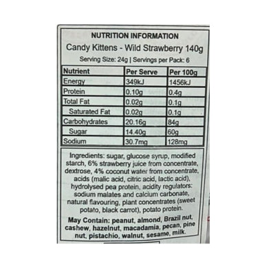 {"id":9894605685032,"title":"Candy Kittens Sweets - Wild Strawberry 140g","handle":"candy-kittens-sweets-wild-strawberry-140g","description":"\u003cp\u003e\u003c!--StartFragment--\u003e\u003c\/p\u003e\n\u003cp\u003e\u003c!--StartFragment--\u003e \u003c!--EndFragment--\u003e\u003c\/p\u003e\n\u003cp\u003e\u003c!--StartFragment--\u003eDescription\u003c!--EndFragment--\u003e\u003c\/p\u003e\n\u003cp\u003e140g. Ingredients: \u003c\/p\u003e\n\u003cp\u003eAllergen information: \u003c\/p\u003e\n\u003cp\u003e \u003c\/p\u003e","published_at":"2025-11-12T10:33:40+11:00","created_at":"2025-11-12T10:33:39+11:00","vendor":"Candy Kittens","type":"Food","tags":["Sweets","Sydney Store"],"price":925,"price_min":925,"price_max":925,"available":false,"price_varies":false,"compare_at_price":null,"compare_at_price_min":0,"compare_at_price_max":0,"compare_at_price_varies":false,"variants":[{"id":50929832788264,"title":"Default Title","option1":"Default Title","option2":null,"option3":null,"sku":"5060384262918","requires_shipping":true,"taxable":true,"featured_image":null,"available":false,"name":"Candy Kittens Sweets - Wild Strawberry 140g","public_title":null,"options":["Default Title"],"price":925,"weight":0,"compare_at_price":null,"inventory_quantity":0,"inventory_management":"shopify","inventory_policy":"deny","barcode":null,"requires_selling_plan":false,"selling_plan_allocations":[]}],"images":["\/\/www.vegangrocerystore.com.au\/cdn\/shop\/files\/CandyKittensWildStrawberry_6be4f336-1e97-4646-8fb7-a60fe7419d36.jpg?v=1763506167","\/\/www.vegangrocerystore.com.au\/cdn\/shop\/files\/candykittenstrawberry-NutritionalInfo.jpg?v=1763956939"],"featured_image":"\/\/www.vegangrocerystore.com.au\/cdn\/shop\/files\/CandyKittensWildStrawberry_6be4f336-1e97-4646-8fb7-a60fe7419d36.jpg?v=1763506167","options":["Title"],"media":[{"alt":null,"id":43006345543976,"position":1,"preview_image":{"aspect_ratio":1.0,"height":1600,"width":1600,"src":"\/\/www.vegangrocerystore.com.au\/cdn\/shop\/files\/CandyKittensWildStrawberry_6be4f336-1e97-4646-8fb7-a60fe7419d36.jpg?v=1763506167"},"aspect_ratio":1.0,"height":1600,"media_type":"image","src":"\/\/www.vegangrocerystore.com.au\/cdn\/shop\/files\/CandyKittensWildStrawberry_6be4f336-1e97-4646-8fb7-a60fe7419d36.jpg?v=1763506167","width":1600},{"alt":null,"id":43044257726760,"position":2,"preview_image":{"aspect_ratio":1.0,"height":400,"width":400,"src":"\/\/www.vegangrocerystore.com.au\/cdn\/shop\/files\/candykittenstrawberry-NutritionalInfo.jpg?v=1763956939"},"aspect_ratio":1.0,"height":400,"media_type":"image","src":"\/\/www.vegangrocerystore.com.au\/cdn\/shop\/files\/candykittenstrawberry-NutritionalInfo.jpg?v=1763956939","width":400}],"requires_selling_plan":false,"selling_plan_groups":[],"content":"\u003cp\u003e\u003c!--StartFragment--\u003e\u003c\/p\u003e\n\u003cp\u003e\u003c!--StartFragment--\u003e \u003c!--EndFragment--\u003e\u003c\/p\u003e\n\u003cp\u003e\u003c!--StartFragment--\u003eDescription\u003c!--EndFragment--\u003e\u003c\/p\u003e\n\u003cp\u003e140g. Ingredients: \u003c\/p\u003e\n\u003cp\u003eAllergen information: \u003c\/p\u003e\n\u003cp\u003e \u003c\/p\u003e"}