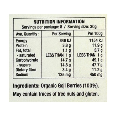 {"id":9486844985640,"title":"Chefs Choice Organic Goji Berries 250g","handle":"chefs-choice-organic-goji-berries-250g","description":"\u003cp\u003e \u003c\/p\u003e\n\u003ch5\u003eReviews\u003c\/h5\u003e\n\u003cp\u003eReviews go here\u003c\/p\u003e\n\u003ch5\u003eIngredients\u003c\/h5\u003e\n\u003cp\u003eAny images, tags, filters, product categories, and any other information on this website showing ingredients, nutrition panels, or allergy statements are for guidance only, as manufacturers often change their formulations without notice. Please contact the manufacturer for the most up-to-date ingredient information, or email us to confirm the ingredients of the stock currently on hand.\u003c\/p\u003e","published_at":"2025-07-16T15:01:29+10:00","created_at":"2024-11-07T14:14:31+11:00","vendor":"Chef's Choice","type":"General","tags":["Dried Fruit","Sydney Store"],"price":1060,"price_min":1060,"price_max":1060,"available":true,"price_varies":false,"compare_at_price":null,"compare_at_price_min":0,"compare_at_price_max":0,"compare_at_price_varies":false,"variants":[{"id":49486853538088,"title":"Default Title","option1":"Default Title","option2":null,"option3":null,"sku":"9339337304309","requires_shipping":true,"taxable":false,"featured_image":null,"available":true,"name":"Chefs Choice Organic Goji Berries 250g","public_title":null,"options":["Default Title"],"price":1060,"weight":0,"compare_at_price":null,"inventory_quantity":4,"inventory_management":"shopify","inventory_policy":"deny","barcode":null,"requires_selling_plan":false,"selling_plan_allocations":[]}],"images":["\/\/www.vegangrocerystore.com.au\/cdn\/shop\/files\/Certified-Organic-Goji-Berries.jpg?v=1730949271","\/\/www.vegangrocerystore.com.au\/cdn\/shop\/files\/chefschoicegoji-NutritionalInformation.jpg?v=1764561107"],"featured_image":"\/\/www.vegangrocerystore.com.au\/cdn\/shop\/files\/Certified-Organic-Goji-Berries.jpg?v=1730949271","options":["Title"],"media":[{"alt":null,"id":40433565008168,"position":1,"preview_image":{"aspect_ratio":1.0,"height":1000,"width":1000,"src":"\/\/www.vegangrocerystore.com.au\/cdn\/shop\/files\/Certified-Organic-Goji-Berries.jpg?v=1730949271"},"aspect_ratio":1.0,"height":1000,"media_type":"image","src":"\/\/www.vegangrocerystore.com.au\/cdn\/shop\/files\/Certified-Organic-Goji-Berries.jpg?v=1730949271","width":1000},{"alt":null,"id":43112604139816,"position":2,"preview_image":{"aspect_ratio":1.0,"height":400,"width":400,"src":"\/\/www.vegangrocerystore.com.au\/cdn\/shop\/files\/chefschoicegoji-NutritionalInformation.jpg?v=1764561107"},"aspect_ratio":1.0,"height":400,"media_type":"image","src":"\/\/www.vegangrocerystore.com.au\/cdn\/shop\/files\/chefschoicegoji-NutritionalInformation.jpg?v=1764561107","width":400}],"requires_selling_plan":false,"selling_plan_groups":[],"content":"\u003cp\u003e \u003c\/p\u003e\n\u003ch5\u003eReviews\u003c\/h5\u003e\n\u003cp\u003eReviews go here\u003c\/p\u003e\n\u003ch5\u003eIngredients\u003c\/h5\u003e\n\u003cp\u003eAny images, tags, filters, product categories, and any other information on this website showing ingredients, nutrition panels, or allergy statements are for guidance only, as manufacturers often change their formulations without notice. Please contact the manufacturer for the most up-to-date ingredient information, or email us to confirm the ingredients of the stock currently on hand.\u003c\/p\u003e"}