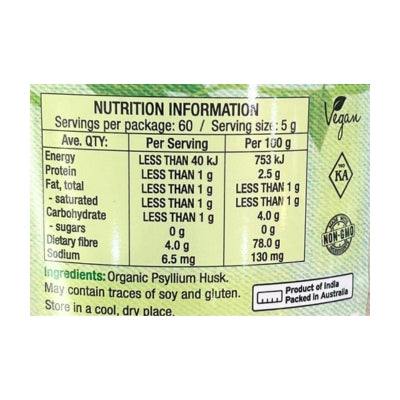 {"id":9486849311016,"title":"Chefs Choice Organic Psyllium Husk 250g","handle":"chefs-choice-organic-psyllium-husk-300g","description":"\u003cp\u003e \u003c\/p\u003e\n\u003ch5\u003eReviews\u003c\/h5\u003e\n\u003cp\u003eReviews go here\u003c\/p\u003e\n\u003ch5\u003eIngredients\u003c\/h5\u003e\n\u003cp\u003eAny images, tags, filters, product categories, and any other information on this website showing ingredients, nutrition panels, or allergy statements are for guidance only, as manufacturers often change their formulations without notice. Please contact the manufacturer for the most up-to-date ingredient information, or email us to confirm the ingredients of the stock currently on hand.\u003c\/p\u003e","published_at":"2025-11-19T11:22:41+11:00","created_at":"2024-11-07T14:34:46+11:00","vendor":"Chef's Choice","type":"General","tags":["Health Food","Sydney Store"],"price":1086,"price_min":1086,"price_max":1086,"available":true,"price_varies":false,"compare_at_price":null,"compare_at_price_min":0,"compare_at_price_max":0,"compare_at_price_varies":false,"variants":[{"id":49486888042792,"title":"Default Title","option1":"Default Title","option2":null,"option3":null,"sku":"9339337007408","requires_shipping":true,"taxable":false,"featured_image":null,"available":true,"name":"Chefs Choice Organic Psyllium Husk 250g","public_title":null,"options":["Default Title"],"price":1086,"weight":0,"compare_at_price":null,"inventory_quantity":2,"inventory_management":"shopify","inventory_policy":"deny","barcode":null,"requires_selling_plan":false,"selling_plan_allocations":[]}],"images":["\/\/www.vegangrocerystore.com.au\/cdn\/shop\/files\/Certified-Organic-Psyllium-Husk.jpg?v=1730950487","\/\/www.vegangrocerystore.com.au\/cdn\/shop\/files\/chef_schoicepsylliumhusk-NutritionalInformation.jpg?v=1764558394"],"featured_image":"\/\/www.vegangrocerystore.com.au\/cdn\/shop\/files\/Certified-Organic-Psyllium-Husk.jpg?v=1730950487","options":["Title"],"media":[{"alt":null,"id":40433613570344,"position":1,"preview_image":{"aspect_ratio":1.0,"height":800,"width":800,"src":"\/\/www.vegangrocerystore.com.au\/cdn\/shop\/files\/Certified-Organic-Psyllium-Husk.jpg?v=1730950487"},"aspect_ratio":1.0,"height":800,"media_type":"image","src":"\/\/www.vegangrocerystore.com.au\/cdn\/shop\/files\/Certified-Organic-Psyllium-Husk.jpg?v=1730950487","width":800},{"alt":null,"id":43112466415912,"position":2,"preview_image":{"aspect_ratio":1.0,"height":400,"width":400,"src":"\/\/www.vegangrocerystore.com.au\/cdn\/shop\/files\/chef_schoicepsylliumhusk-NutritionalInformation.jpg?v=1764558394"},"aspect_ratio":1.0,"height":400,"media_type":"image","src":"\/\/www.vegangrocerystore.com.au\/cdn\/shop\/files\/chef_schoicepsylliumhusk-NutritionalInformation.jpg?v=1764558394","width":400}],"requires_selling_plan":false,"selling_plan_groups":[],"content":"\u003cp\u003e \u003c\/p\u003e\n\u003ch5\u003eReviews\u003c\/h5\u003e\n\u003cp\u003eReviews go here\u003c\/p\u003e\n\u003ch5\u003eIngredients\u003c\/h5\u003e\n\u003cp\u003eAny images, tags, filters, product categories, and any other information on this website showing ingredients, nutrition panels, or allergy statements are for guidance only, as manufacturers often change their formulations without notice. Please contact the manufacturer for the most up-to-date ingredient information, or email us to confirm the ingredients of the stock currently on hand.\u003c\/p\u003e"}