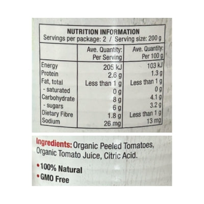 {"id":9486852784424,"title":"Chefs Choice Organic Tomatoes - Whole \u0026 Peeled Canned 400g","handle":"chefs-choice-organic-tomatoes-whole-peeled-canned-400g","description":"\u003cp\u003e \u003c\/p\u003e\n\u003ch5\u003eReviews\u003c\/h5\u003e\n\u003cp\u003eReviews go here\u003c\/p\u003e\n\u003ch5\u003eIngredients\u003c\/h5\u003e\n\u003cp\u003eAny images, tags, filters, product categories, and any other information on this website showing ingredients, nutrition panels, or allergy statements are for guidance only, as manufacturers often change their formulations without notice. Please contact the manufacturer for the most up-to-date ingredient information, or email us to confirm the ingredients of the stock currently on hand.\u003c\/p\u003e","published_at":"2025-07-16T15:02:18+10:00","created_at":"2024-11-07T14:49:41+11:00","vendor":"Chef's Choice","type":"General","tags":["Cooking Sauces","Sydney Store"],"price":286,"price_min":286,"price_max":286,"available":true,"price_varies":false,"compare_at_price":null,"compare_at_price_min":0,"compare_at_price_max":0,"compare_at_price_varies":false,"variants":[{"id":49486909341992,"title":"Default Title","option1":"Default Title","option2":null,"option3":null,"sku":"9339337004711","requires_shipping":true,"taxable":false,"featured_image":null,"available":true,"name":"Chefs Choice Organic Tomatoes - Whole \u0026 Peeled Canned 400g","public_title":null,"options":["Default Title"],"price":286,"weight":400,"compare_at_price":null,"inventory_quantity":4,"inventory_management":"shopify","inventory_policy":"deny","barcode":null,"requires_selling_plan":false,"selling_plan_allocations":[]}],"images":["\/\/www.vegangrocerystore.com.au\/cdn\/shop\/files\/Certified-Organic-Whole-Peeled-Tomatoes-400g.jpg?v=1730951381","\/\/www.vegangrocerystore.com.au\/cdn\/shop\/files\/Chef_sChoiceWholeTomatoes-NutritionalInformation.jpg?v=1764811308"],"featured_image":"\/\/www.vegangrocerystore.com.au\/cdn\/shop\/files\/Certified-Organic-Whole-Peeled-Tomatoes-400g.jpg?v=1730951381","options":["Title"],"media":[{"alt":null,"id":40433649811752,"position":1,"preview_image":{"aspect_ratio":1.0,"height":800,"width":800,"src":"\/\/www.vegangrocerystore.com.au\/cdn\/shop\/files\/Certified-Organic-Whole-Peeled-Tomatoes-400g.jpg?v=1730951381"},"aspect_ratio":1.0,"height":800,"media_type":"image","src":"\/\/www.vegangrocerystore.com.au\/cdn\/shop\/files\/Certified-Organic-Whole-Peeled-Tomatoes-400g.jpg?v=1730951381","width":800},{"alt":null,"id":43127189864744,"position":2,"preview_image":{"aspect_ratio":1.0,"height":400,"width":400,"src":"\/\/www.vegangrocerystore.com.au\/cdn\/shop\/files\/Chef_sChoiceWholeTomatoes-NutritionalInformation.jpg?v=1764811308"},"aspect_ratio":1.0,"height":400,"media_type":"image","src":"\/\/www.vegangrocerystore.com.au\/cdn\/shop\/files\/Chef_sChoiceWholeTomatoes-NutritionalInformation.jpg?v=1764811308","width":400}],"requires_selling_plan":false,"selling_plan_groups":[],"content":"\u003cp\u003e \u003c\/p\u003e\n\u003ch5\u003eReviews\u003c\/h5\u003e\n\u003cp\u003eReviews go here\u003c\/p\u003e\n\u003ch5\u003eIngredients\u003c\/h5\u003e\n\u003cp\u003eAny images, tags, filters, product categories, and any other information on this website showing ingredients, nutrition panels, or allergy statements are for guidance only, as manufacturers often change their formulations without notice. Please contact the manufacturer for the most up-to-date ingredient information, or email us to confirm the ingredients of the stock currently on hand.\u003c\/p\u003e"}