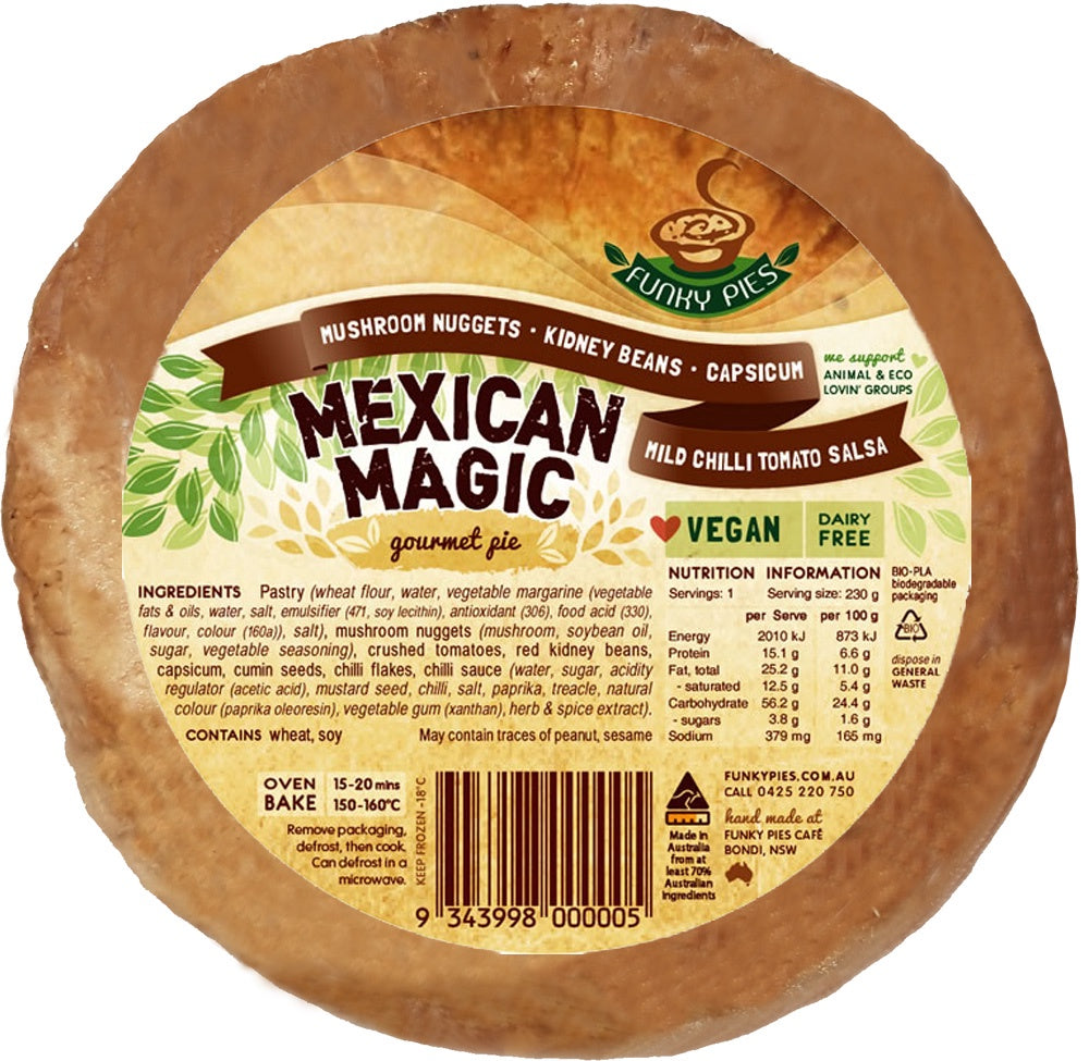 {"id":9431389634856,"title":"Funky Pie - Mexican Magic 230g (cold)","handle":"funky-pies-mexican-magic-cold","description":"\u003cp\u003eA delicious combination of meaty mushroom nuggets in a hot tomato salsa with capsicum and kidney beans.\u003c\/p\u003e\n\u003cp\u003eMay defrost in transit, we do not recommend re-freezing.\u003c\/p\u003e\n\u003ch5\u003eReviews\u003c\/h5\u003e\n\u003cp\u003eReviews go here\u003c\/p\u003e\n\u003ch5\u003eIngredients\u003c\/h5\u003e\n\u003cp\u003eAny images, tags, filters, product categories, and any other information on this website showing ingredients, nutrition panels, or allergy statements are for guidance only, as manufacturers often change their formulations without notice. Please contact the manufacturer for the most up-to-date ingredient information, or email us to confirm the ingredients of the stock currently on hand.\u003c\/p\u003e\n\u003ch5\u003eImportant Shipping Note\u003c\/h5\u003e\n\u003cdiv\u003e\n\u003cspan\u003eAll orders containing chilled products, frozen products and chocolates must include a Cooler to protect them in transit. The\u003c\/span\u003e\u003cspan\u003e \u003c\/span\u003e\u003cspan\u003eCooler\u003c\/span\u003e\u003cspan\u003e will automatically add to your order when a cold product is added to your shopping cart. \u003c\/span\u003e\u003cspan\u003eFrozen items may defrost in transit, we can not recommend re-freezing. \u003c\/span\u003e\u003cspan\u003eWe will select the correct size cooler for your order. Chilled orders can only be sent to certain areas, please refer to our \u003c\/span\u003e\u003ca href=\"https:\/\/www.crueltyfreeshop.com.au\/pages\/faq#refrid\" rel=\"noopener\" target=\"_blank\" data-saferedirecturl=\"https:\/\/www.google.com\/url?q=https:\/\/www.crueltyfreeshop.com.au\/pages\/faq%23refrid\u0026amp;source=gmail\u0026amp;ust=1664430462005000\u0026amp;usg=AOvVaw3YpBIvhTwoxQRA_PVqbP_L\"\u003eFAQ\u003c\/a\u003e\u003cspan\u003e or email us at \u003c\/span\u003e\u003ca href=\"mailto:online@vegangrocerystore.com.au\" rel=\"noopener\" target=\"_blank\"\u003eonline@vegangrocerystore.\u003cwbr\u003ecom.au\u003c\/wbr\u003e\u003c\/a\u003e\n\u003c\/div\u003e","published_at":"2025-03-05T13:36:24+11:00","created_at":"2024-09-09T12:40:53+10:00","vendor":"Funky Pies","type":"Refrig food","tags":["Pies","Sydney Store"],"price":783,"price_min":783,"price_max":783,"available":true,"price_varies":false,"compare_at_price":null,"compare_at_price_min":0,"compare_at_price_max":0,"compare_at_price_varies":false,"variants":[{"id":49202166628648,"title":"Default Title","option1":"Default Title","option2":null,"option3":null,"sku":"9343998000005","requires_shipping":true,"taxable":true,"featured_image":null,"available":true,"name":"Funky Pie - Mexican Magic 230g (cold)","public_title":null,"options":["Default Title"],"price":783,"weight":0,"compare_at_price":null,"inventory_quantity":1,"inventory_management":"shopify","inventory_policy":"deny","barcode":null,"requires_selling_plan":false,"selling_plan_allocations":[]}],"images":["\/\/www.vegangrocerystore.com.au\/cdn\/shop\/files\/Mexican-Magic-Pie.jpg?v=1725849653","\/\/www.vegangrocerystore.com.au\/cdn\/shop\/files\/mexicanmagic-NutritionalInfo.jpg?v=1763610427","\/\/www.vegangrocerystore.com.au\/cdn\/shop\/files\/mexicanmagic-ingredients.jpg?v=1763610428"],"featured_image":"\/\/www.vegangrocerystore.com.au\/cdn\/shop\/files\/Mexican-Magic-Pie.jpg?v=1725849653","options":["Title"],"media":[{"alt":null,"id":40008300757288,"position":1,"preview_image":{"aspect_ratio":1.026,"height":975,"width":1000,"src":"\/\/www.vegangrocerystore.com.au\/cdn\/shop\/files\/Mexican-Magic-Pie.jpg?v=1725849653"},"aspect_ratio":1.026,"height":975,"media_type":"image","src":"\/\/www.vegangrocerystore.com.au\/cdn\/shop\/files\/Mexican-Magic-Pie.jpg?v=1725849653","width":1000},{"alt":null,"id":43015557972264,"position":2,"preview_image":{"aspect_ratio":1.0,"height":400,"width":400,"src":"\/\/www.vegangrocerystore.com.au\/cdn\/shop\/files\/mexicanmagic-NutritionalInfo.jpg?v=1763610427"},"aspect_ratio":1.0,"height":400,"media_type":"image","src":"\/\/www.vegangrocerystore.com.au\/cdn\/shop\/files\/mexicanmagic-NutritionalInfo.jpg?v=1763610427","width":400},{"alt":null,"id":43015558005032,"position":3,"preview_image":{"aspect_ratio":1.0,"height":400,"width":400,"src":"\/\/www.vegangrocerystore.com.au\/cdn\/shop\/files\/mexicanmagic-ingredients.jpg?v=1763610428"},"aspect_ratio":1.0,"height":400,"media_type":"image","src":"\/\/www.vegangrocerystore.com.au\/cdn\/shop\/files\/mexicanmagic-ingredients.jpg?v=1763610428","width":400}],"requires_selling_plan":false,"selling_plan_groups":[],"content":"\u003cp\u003eA delicious combination of meaty mushroom nuggets in a hot tomato salsa with capsicum and kidney beans.\u003c\/p\u003e\n\u003cp\u003eMay defrost in transit, we do not recommend re-freezing.\u003c\/p\u003e\n\u003ch5\u003eReviews\u003c\/h5\u003e\n\u003cp\u003eReviews go here\u003c\/p\u003e\n\u003ch5\u003eIngredients\u003c\/h5\u003e\n\u003cp\u003eAny images, tags, filters, product categories, and any other information on this website showing ingredients, nutrition panels, or allergy statements are for guidance only, as manufacturers often change their formulations without notice. Please contact the manufacturer for the most up-to-date ingredient information, or email us to confirm the ingredients of the stock currently on hand.\u003c\/p\u003e\n\u003ch5\u003eImportant Shipping Note\u003c\/h5\u003e\n\u003cdiv\u003e\n\u003cspan\u003eAll orders containing chilled products, frozen products and chocolates must include a Cooler to protect them in transit. The\u003c\/span\u003e\u003cspan\u003e \u003c\/span\u003e\u003cspan\u003eCooler\u003c\/span\u003e\u003cspan\u003e will automatically add to your order when a cold product is added to your shopping cart. \u003c\/span\u003e\u003cspan\u003eFrozen items may defrost in transit, we can not recommend re-freezing. \u003c\/span\u003e\u003cspan\u003eWe will select the correct siz