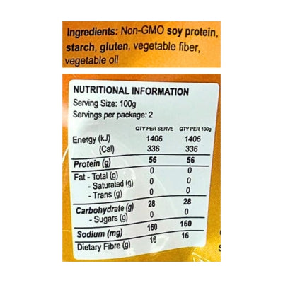 200g. Ingredients: Soy protein, starch, gluten, vegetable fibre, vegetable oil, salt.