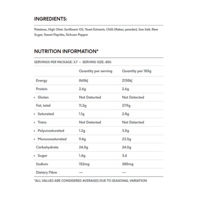 {"id":9848474665256,"title":"Proper Crisps Chilli Crisps 150g","handle":"proper-core-chilli-crisp-150g","description":"\u003cp\u003e \u003c\/p\u003e\n\u003ch5\u003eReviews\u003c\/h5\u003e\n\u003cp\u003eReviews go here\u003c\/p\u003e\n\u003ch5\u003eIngredients\u003c\/h5\u003e\n\u003cp\u003eAny images, tags, filters, product categories, and any other information on this website showing ingredients, nutrition panels, or allergy statements are for guidance only, as manufacturers often change their formulations without notice. Please contact the manufacturer for the most up-to-date ingredient information, or email us to confirm the ingredients of the stock currently on hand.\u003c\/p\u003e","published_at":"2025-10-13T13:27:16+11:00","created_at":"2025-10-13T13:27:15+11:00","vendor":"Proper Crisps","type":"","tags":["Crisps","Sydney Store"],"price":699,"price_min":699,"price_max":699,"available":true,"price_varies":false,"compare_at_price":null,"compare_at_price_min":0,"compare_at_price_max":0,"compare_at_price_varies":false,"variants":[{"id":50826274898216,"title":"Default Title","option1":"Default Title","option2":null,"option3":null,"sku":"9421906305111","requires_shipping":true,"taxable":true,"featured_image":null,"available":true,"name":"Proper Crisps Chilli Crisps 150g","public_title":null,"options":["Default Title"],"price":699,"weight":0,"compare_at_price":null,"inventory_quantity":2,"inventory_management":"shopify","inventory_policy":"deny","barcode":null,"requires_selling_plan":false,"selling_plan_allocations":[]}],"images":["\/\/www.vegangrocerystore.com.au\/cdn\/shop\/files\/ProperCrispsChilliCrisps150g.png?v=1764728498","\/\/www.vegangrocerystore.com.au\/cdn\/shop\/files\/ProperChilli-NutritionalInfo.jpg?v=1768344469"],"featured_image":"\/\/www.vegangrocerystore.com.au\/cdn\/shop\/files\/ProperCrispsChilliCrisps150g.png?v=1764728498","options":["Title"],"media":[{"alt":null,"id":43121738285352,"position":1,"preview_image":{"aspect_ratio":1.0,"height":800,"width":800,"src":"\/\/www.vegangrocerystore.com.au\/cdn\/shop\/files\/ProperCrispsChilliCrisps150g.png?v=1764728498"},"aspect_ratio":1.0,"height":800,"media_type":"image","src":"\/\/www.vegangrocerystore.com.au\/cdn\/shop\/files\/ProperCrispsChilliCrisps150g.png?v=1764728498","width":800},{"alt":null,"id":43302486933800,"position":2,"preview_image":{"aspect_ratio":1.0,"height":400,"width":400,"src":"\/\/www.vegangrocerystore.com.au\/cdn\/shop\/files\/ProperChilli-NutritionalInfo.jpg?v=1768344469"},"aspect_ratio":1.0,"height":400,"media_type":"image","src":"\/\/www.vegangrocerystore.com.au\/cdn\/shop\/files\/ProperChilli-NutritionalInfo.jpg?v=1768344469","width":400}],"requires_selling_plan":false,"selling_plan_groups":[],"content":"\u003cp\u003e \u003c\/p\u003e\n\u003ch5\u003eReviews\u003c\/h5\u003e\n\u003cp\u003eReviews go here\u003c\/p\u003e\n\u003ch5\u003eIngredients\u003c\/h5\u003e\n\u003cp\u003eAny images, tags, filters, product categories, and any other information on this website showing ingredients, nutrition panels, or allergy statements are for guidance only, as manufacturers often change their formulations without notice. Please contact the manufacturer for the most up-to-date ingredient information, or email us to confirm the ingredients of the stock currently on hand.\u003c\/p\u003e"}