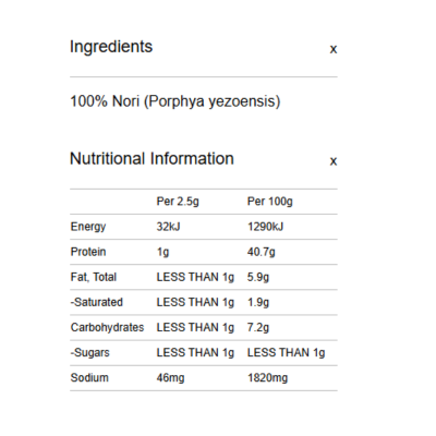 {"id":9486880407848,"title":"Spiral Foods - Nori 25g","handle":"spiral-foods-nori-25g","description":"\u003cp\u003e \u003c\/p\u003e\n\u003ch5\u003eReviews\u003c\/h5\u003e\n\u003cp\u003eReviews go here\u003c\/p\u003e\n\u003ch5\u003eIngredients\u003c\/h5\u003e\n\u003cp\u003eAny images, tags, filters, product categories, and any other information on this website showing ingredients, nutrition panels, or allergy statements are for guidance only, as manufacturers often change their formulations without notice. Please contact the manufacturer for the most up-to-date ingredient information, or email us to confirm the ingredients of the stock currently on hand.\u003c\/p\u003e","published_at":"2025-09-15T16:32:53+10:00","created_at":"2024-11-07T17:02:50+11:00","vendor":"Spiral Foods","type":"General","tags":["Seaweed","Sydney Store"],"price":858,"price_min":858,"price_max":858,"available":true,"price_varies":false,"compare_at_price":null,"compare_at_price_min":0,"compare_at_price_max":0,"compare_at_price_varies":false,"variants":[{"id":49487108243752,"title":"Default Title","option1":"Default Title","option2":null,"option3":null,"sku":"9312336015704","requires_shipping":true,"taxable":false,"featured_image":null,"available":true,"name":"Spiral Foods - Nori 25g","public_title":null,"options":["Default Title"],"price":858,"weight":0,"compare_at_price":null,"inventory_quantity":4,"inventory_management":"shopify","inventory_policy":"deny","barcode":null,"requires_selling_plan":false,"selling_plan_allocations":[]}],"images":["\/\/www.vegangrocerystore.com.au\/cdn\/shop\/files\/Spiral_SeaVeg_Nori_1.jpg?v=1730959370","\/\/www.vegangrocerystore.com.au\/cdn\/shop\/files\/SpiralNoriSheets-NutritionalInformation_8669acf8-834f-41be-a3d0-87cf39a06e00.png?v=1764551116"],"featured_image":"\/\/www.vegangrocerystore.com.au\/cdn\/shop\/files\/Spiral_SeaVeg_Nori_1.jpg?v=1730959370","options":["Title"],"media":[{"alt":null,"id":40433990959400,"position":1,"preview_image":{"aspect_ratio":1.0,"height":2000,"width":2000,"src":"\/\/www.vegangrocerystore.com.au\/cdn\/shop\/files\/Spiral_SeaVeg_Nori_1.jpg?v=1730959370"},"aspect_ratio":1.0,"height":2000,"media_type":"image","src":"\/\/www.vegangrocerystore.com.au\/cdn\/shop\/files\/Spiral_SeaVeg_Nori_1.jpg?v=1730959370","width":2000},{"alt":null,"id":43111954317608,"position":2,"preview_image":{"aspect_ratio":1.0,"height":400,"width":400,"src":"\/\/www.vegangrocerystore.com.au\/cdn\/shop\/files\/SpiralNoriSheets-NutritionalInformation_8669acf8-834f-41be-a3d0-87cf39a06e00.png?v=1764551116"},"aspect_ratio":1.0,"height":400,"media_type":"image","src":"\/\/www.vegangrocerystore.com.au\/cdn\/shop\/files\/SpiralNoriSheets-NutritionalInformation_8669acf8-834f-41be-a3d0-87cf39a06e00.png?v=1764551116","width":400}],"requires_selling_plan":false,"selling_plan_groups":[],"content":"\u003cp\u003e \u003c\/p\u003e\n\u003ch5\u003eReviews\u003c\/h5\u003e\n\u003cp\u003eReviews go here\u003c\/p\u003e\n\u003ch5\u003eIngredients\u003c\/h5\u003e\n\u003cp\u003eAny images, tags, filters, product categories, and any other information on this website showing ingredients, nutrition panels, or allergy statements are for guidance only, as manufacturers often change their formulations without notice. Please contact the manufacturer for the most up-to-date ingredient information, or email us to confirm the ingredients of the stock currently on hand.\u003c\/p\u003e"}