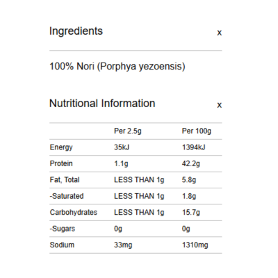 {"id":9486880440616,"title":"Spiral Foods - Nori Yaki Sushi Nori 25g","handle":"spiral-foods-nori-yaki-sushi-nori-25g","description":"\u003cp\u003e \u003c\/p\u003e\n\u003ch5\u003eReviews\u003c\/h5\u003e\n\u003cp\u003eReviews go here\u003c\/p\u003e\n\u003ch5\u003eIngredients\u003c\/h5\u003e\n\u003cp\u003eAny images, tags, filters, product categories, and any other information on this website showing ingredients, nutrition panels, or allergy statements are for guidance only, as manufacturers often change their formulations without notice. Please contact the manufacturer for the most up-to-date ingredient information, or email us to confirm the ingredients of the stock currently on hand.\u003c\/p\u003e","published_at":"2025-09-15T16:36:04+10:00","created_at":"2024-11-07T17:03:18+11:00","vendor":"Spiral Foods","type":"General","tags":["Seaweed","Sydney Store"],"price":896,"price_min":896,"price_max":896,"available":true,"price_varies":false,"compare_at_price":null,"compare_at_price_min":0,"compare_at_price_max":0,"compare_at_price_varies":false,"variants":[{"id":49487108276520,"title":"Default Title","option1":"Default Title","option2":null,"option3":null,"sku":"9312336015766","requires_shipping":true,"taxable":false,"featured_image":null,"available":true,"name":"Spiral Foods - Nori Yaki Sushi Nori 25g","public_title":null,"options":["Default Title"],"price":896,"weight":0,"compare_at_price":null,"inventory_quantity":2,"inventory_management":"shopify","inventory_policy":"deny","barcode":null,"requires_selling_plan":false,"selling_plan_allocations":[]}],"images":["\/\/www.vegangrocerystore.com.au\/cdn\/shop\/files\/Spiral_SeaVeg_NoriSheets_1.jpg?v=1730959398","\/\/www.vegangrocerystore.com.au\/cdn\/shop\/files\/SpiralSushiNori-NutritionalInformation.png?v=1764552710"],"featured_image":"\/\/www.vegangrocerystore.com.au\/cdn\/shop\/files\/Spiral_SeaVeg_NoriSheets_1.jpg?v=1730959398","options":["Title"],"media":[{"alt":null,"id":40433991811368,"position":1,"preview_image":{"aspect_ratio":1.0,"height":2000,"width":2000,"src":"\/\/www.vegangrocerystore.com.au\/cdn\/shop\/files\/Spiral_SeaVeg_NoriSheets_1.jpg?v=1730959398"},"aspect_ratio":1.0,"height":2000,"media_type":"image","src":"\/\/www.vegangrocerystore.com.au\/cdn\/shop\/files\/Spiral_SeaVeg_NoriSheets_1.jpg?v=1730959398","width":2000},{"alt":null,"id":43112057307432,"position":2,"preview_image":{"aspect_ratio":1.0,"height":400,"width":400,"src":"\/\/www.vegangrocerystore.com.au\/cdn\/shop\/files\/SpiralSushiNori-NutritionalInformation.png?v=1764552710"},"aspect_ratio":1.0,"height":400,"media_type":"image","src":"\/\/www.vegangrocerystore.com.au\/cdn\/shop\/files\/SpiralSushiNori-NutritionalInformation.png?v=1764552710","width":400}],"requires_selling_plan":false,"selling_plan_groups":[],"content":"\u003cp\u003e \u003c\/p\u003e\n\u003ch5\u003eReviews\u003c\/h5\u003e\n\u003cp\u003eReviews go here\u003c\/p\u003e\n\u003ch5\u003eIngredients\u003c\/h5\u003e\n\u003cp\u003eAny images, tags, filters, product categories, and any other information on this website showing ingredients, nutrition panels, or allergy statements are for guidance only, as manufacturers often change their formulations without notice. Please contact the manufacturer for the most up-to-date ingredient information, or email us to confirm the ingredients of the stock currently on hand.\u003c\/p\u003e"}