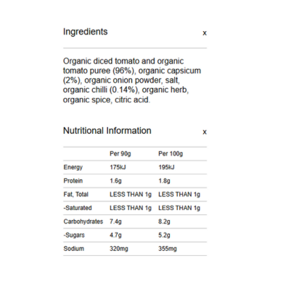 {"id":9486878802216,"title":"Spiral Foods Pasta Sauce - Arrabbiata Organic 375g","handle":"spiral-foods-pasta-sauce-arrabbiata-organic-375g","description":"\u003cp\u003e \u003c\/p\u003e\n\u003ch5\u003eReviews\u003c\/h5\u003e\n\u003cp\u003eReviews go here\u003c\/p\u003e\n\u003ch5\u003eIngredients\u003c\/h5\u003e\n\u003cp\u003eAny images, tags, filters, product categories, and any other information on this website showing ingredients, nutrition panels, or allergy statements are for guidance only, as manufacturers often change their formulations without notice. Please contact the manufacturer for the most up-to-date ingredient information, or email us to confirm the ingredients of the stock currently on hand.\u003c\/p\u003e","published_at":"2025-03-05T12:37:13+11:00","created_at":"2024-11-07T16:48:23+11:00","vendor":"Spiral Foods","type":"General","tags":["Cooking Sauces","Pasta","Savoury Sauces","Sydney Store"],"price":556,"price_min":556,"price_max":556,"available":true,"price_varies":false,"compare_at_price":null,"compare_at_price_min":0,"compare_at_price_max":0,"compare_at_price_varies":false,"variants":[{"id":49487096316200,"title":"Default Title","option1":"Default Title","option2":null,"option3":null,"sku":"9312336790014","requires_shipping":true,"taxable":false,"featured_image":null,"available":true,"name":"Spiral Foods Pasta Sauce - Arrabbiata Organic 375g","public_title":null,"options":["Default Title"],"price":556,"weight":0,"compare_at_price":null,"inventory_quantity":4,"inventory_management":"shopify","inventory_policy":"deny","barcode":null,"requires_selling_plan":false,"selling_plan_allocations":[]}],"images":["\/\/www.vegangrocerystore.com.au\/cdn\/shop\/files\/Spiral_Pasta-Sauce_Arrabbiata_Organic_375g_Front_2000x2000px.jpg?v=1730958503","\/\/www.vegangrocerystore.com.au\/cdn\/shop\/files\/SpiralArrabbiata-NutritionalInformation.png?v=1764552787"],"featured_image":"\/\/www.vegangrocerystore.com.au\/cdn\/shop\/files\/Spiral_Pasta-Sauce_Arrabbiata_Organic_375g_Front_2000x2000px.jpg?v=1730958503","options":["Title"],"media":[{"alt":null,"id":40433959502120,"position":1,"preview_image":{"aspect_ratio":1.0,"height":2000,"width":2000,"src":"\/\/www.vegangrocerystore.com.au\/cdn\/shop\/files\/Spiral_Pasta-Sauce_Arrabbiata_Organic_375g_Front_2000x2000px.jpg?v=1730958503"},"aspect_ratio":1.0,"height":2000,"media_type":"image","src":"\/\/www.vegangrocerystore.com.au\/cdn\/shop\/files\/Spiral_Pasta-Sauce_Arrabbiata_Organic_375g_Front_2000x2000px.jpg?v=1730958503","width":2000},{"alt":null,"id":43112059732264,"position":2,"preview_image":{"aspect_ratio":1.0,"height":400,"width":400,"src":"\/\/www.vegangrocerystore.com.au\/cdn\/shop\/files\/SpiralArrabbiata-NutritionalInformation.png?v=1764552787"},"aspect_ratio":1.0,"height":400,"media_type":"image","src":"\/\/www.vegangrocerystore.com.au\/cdn\/shop\/files\/SpiralArrabbiata-NutritionalInformation.png?v=1764552787","width":400}],"requires_selling_plan":false,"selling_plan_groups":[],"content":"\u003cp\u003e \u003c\/p\u003e\n\u003ch5\u003eReviews\u003c\/h5\u003e\n\u003cp\u003eReviews go here\u003c\/p\u003e\n\u003ch5\u003eIngredients\u003c\/h5\u003e\n\u003cp\u003eAny images, tags, filters, product categories, and any other information on this website showing ingredients, nutrition panels, or allergy statements are for guidance only, as manufacturers often change their formulations without notice. Please contact the manufacturer for the most up-to-date ingredient information, or email us to confirm the ingredients of the stock currently on hand.\u003c\/p\u003e"}