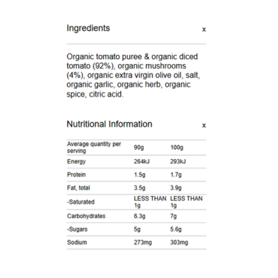{"id":9486878900520,"title":"Spiral Foods Pasta Sauce - Fungi Organic 375g","handle":"spiral-foods-pasta-sauce-fungi-organic-375g","description":"\u003cp\u003e \u003c\/p\u003e\n\u003ch5\u003eReviews\u003c\/h5\u003e\n\u003cp\u003eReviews go here\u003c\/p\u003e\n\u003ch5\u003eIngredients\u003c\/h5\u003e\n\u003cp\u003eAny images, tags, filters, product categories, and any other information on this website showing ingredients, nutrition panels, or allergy statements are for guidance only, as manufacturers often change their formulations without notice. Please contact the manufacturer for the most up-to-date ingredient information, or email us to confirm the ingredients of the stock currently on hand.\u003c\/p\u003e","published_at":"2025-03-05T12:37:26+11:00","created_at":"2024-11-07T16:48:46+11:00","vendor":"Spiral Foods","type":"General","tags":["Cooking Sauces","Pasta","Savoury Sauces","Sydney Store"],"price":556,"price_min":556,"price_max":556,"available":true,"price_varies":false,"compare_at_price":null,"compare_at_price_min":0,"compare_at_price_max":0,"compare_at_price_varies":false,"variants":[{"id":49487096447272,"title":"Default Title","option1":"Default Title","option2":null,"option3":null,"sku":"9312336790021","requires_shipping":true,"taxable":false,"featured_image":null,"available":true,"name":"Spiral Foods Pasta Sauce - Fungi Organic 375g","public_title":null,"options":["Default Title"],"price":556,"weight":0,"compare_at_price":null,"inventory_quantity":4,"inventory_management":"shopify","inventory_policy":"deny","barcode":null,"requires_selling_plan":false,"selling_plan_allocations":[]}],"images":["\/\/www.vegangrocerystore.com.au\/cdn\/shop\/files\/Spiral_Pasta-Sauce_Funghi_Organic_375g_2000x2000px.jpg?v=1730958526","\/\/www.vegangrocerystore.com.au\/cdn\/shop\/files\/SpiralFunghi-NutritionalInformation.png?v=1764552784"],"featured_image":"\/\/www.vegangrocerystore.com.au\/cdn\/shop\/files\/Spiral_Pasta-Sauce_Funghi_Organic_375g_2000x2000px.jpg?v=1730958526","options":["Title"],"media":[{"alt":null,"id":40433960747304,"position":1,"preview_image":{"aspect_ratio":1.0,"height":2000,"width":2000,"src":"\/\/www.vegangrocerystore.com.au\/cdn\/shop\/files\/Spiral_Pasta-Sauce_Funghi_Organic_375g_2000x2000px.jpg?v=1730958526"},"aspect_ratio":1.0,"height":2000,"media_type":"image","src":"\/\/www.vegangrocerystore.com.au\/cdn\/shop\/files\/Spiral_Pasta-Sauce_Funghi_Organic_375g_2000x2000px.jpg?v=1730958526","width":2000},{"alt":null,"id":43112059699496,"position":2,"preview_image":{"aspect_ratio":1.0,"height":400,"width":400,"src":"\/\/www.vegangrocerystore.com.au\/cdn\/shop\/files\/SpiralFunghi-NutritionalInformation.png?v=1764552784"},"aspect_ratio":1.0,"height":400,"media_type":"image","src":"\/\/www.vegangrocerystore.com.au\/cdn\/shop\/files\/SpiralFunghi-NutritionalInformation.png?v=1764552784","width":400}],"requires_selling_plan":false,"selling_plan_groups":[],"content":"\u003cp\u003e \u003c\/p\u003e\n\u003ch5\u003eReviews\u003c\/h5\u003e\n\u003cp\u003eReviews go here\u003c\/p\u003e\n\u003ch5\u003eIngredients\u003c\/h5\u003e\n\u003cp\u003eAny images, tags, filters, product categories, and any other information on this website showing ingredients, nutrition panels, or allergy statements are for guidance only, as manufacturers often change their formulations without notice. Please contact the manufacturer for the most up-to-date ingredient information, or email us to confirm the ingredients of the stock currently on hand.\u003c\/p\u003e"}