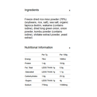 {"id":9486879850792,"title":"Spiral Foods Soup - Instant Miso Soup Red (5pk x 7g)","handle":"spiral-foods-soup-instant-miso-soup-red-5pk-x-7g","description":"\u003cp\u003e \u003c\/p\u003e\n\u003ch5\u003eReviews\u003c\/h5\u003e\n\u003cp\u003eReviews go here\u003c\/p\u003e\n\u003ch5\u003eIngredients\u003c\/h5\u003e\n\u003cp\u003eAny images, tags, filters, product categories, and any other information on this website showing ingredients, nutrition panels, or allergy statements are for guidance only, as manufacturers often change their formulations without notice. Please contact the manufacturer for the most up-to-date ingredient information, or email us to confirm the ingredients of the stock currently on hand.\u003c\/p\u003e","published_at":"2025-09-15T16:32:27+10:00","created_at":"2024-11-07T16:58:37+11:00","vendor":"Spiral Foods","type":"General","tags":["Instant Meals","Soups","Sydney Store"],"price":733,"price_min":733,"price_max":733,"available":true,"price_varies":false,"compare_at_price":null,"compare_at_price_min":0,"compare_at_price_max":0,"compare_at_price_varies":false,"variants":[{"id":49487105196328,"title":"Default Title","option1":"Default Title","option2":null,"option3":null,"sku":"9312336039502","requires_shipping":true,"taxable":false,"featured_image":null,"available":true,"name":"Spiral Foods Soup - Instant Miso Soup Red (5pk x 7g)","public_title":null,"options":["Default Title"],"price":733,"weight":0,"compare_at_price":null,"inventory_quantity":3,"inventory_management":"shopify","inventory_policy":"deny","barcode":null,"requires_selling_plan":false,"selling_plan_allocations":[]}],"images":["\/\/www.vegangrocerystore.com.au\/cdn\/shop\/files\/Spiral_Miso_InstantRed5_1.jpg?v=1730959117","\/\/www.vegangrocerystore.com.au\/cdn\/shop\/files\/SpiralInstantRedMisoSoup-NutritionalInformation.png?v=1764551353"],"featured_image":"\/\/www.vegangrocerystore.com.au\/cdn\/shop\/files\/Spiral_Miso_InstantRed5_1.jpg?v=1730959117","options":["Title"],"media":[{"alt":null,"id":40433982996776,"position":1,"preview_image":{"aspect_ratio":1.0,"height":2000,"width":2000,"src":"\/\/www.vegangrocerystore.com.au\/cdn\/shop\/files\/Spiral_Miso_InstantRed5_1.jpg?v=1730959117"},"aspect_ratio":1.0,"height":2000,"media_type":"image","src":"\/\/www.vegangrocerystore.com.au\/cdn\/shop\/files\/Spiral_Miso_InstantRed5_1.jpg?v=1730959117","width":2000},{"alt":null,"id":43111978926376,"position":2,"preview_image":{"aspect_ratio":1.0,"height":400,"width":400,"src":"\/\/www.vegangrocerystore.com.au\/cdn\/shop\/files\/SpiralInstantRedMisoSoup-NutritionalInformation.png?v=1764551353"},"aspect_ratio":1.0,"height":400,"media_type":"image","src":"\/\/www.vegangrocerystore.com.au\/cdn\/shop\/files\/SpiralInstantRedMisoSoup-NutritionalInformation.png?v=1764551353","width":400}],"requires_selling_plan":false,"selling_plan_groups":[],"content":"\u003cp\u003e \u003c\/p\u003e\n\u003ch5\u003eReviews\u003c\/h5\u003e\n\u003cp\u003eReviews go here\u003c\/p\u003e\n\u003ch5\u003eIngredients\u003c\/h5\u003e\n\u003cp\u003eAny images, tags, filters, product categories, and any other information on this website showing ingredients, nutrition panels, or allergy statements are for guidance only, as manufacturers often change their formulations without notice. Please contact the manufacturer for the most up-to-date ingredient information, or email us to confirm the ingredients of the stock currently on hand.\u003c\/p\u003e"}