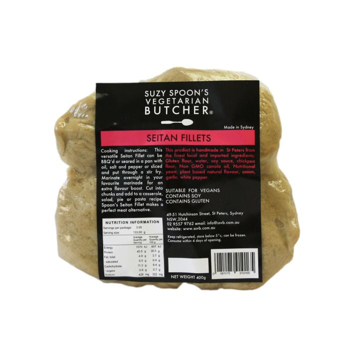 {"id":5278924013725,"title":"Suzy Spoons Vegan Chicken Fillets 400g (cold)","handle":"suzyspoonsseitanfilets400gcold-case-6","description":"\u003cp\u003eThis versatile Seitan Chicken Fillet can be BBQ’d or seared in a pan with oil, salt and pepper or sliced and put through a stir fry. Marinate overnight in your favourite marinade for an extra flavour boost. Cook until piping hot all the way through. Cut into chunks and add to a casserole, salad, pie or pasta recipe. Spoon’s Seitan Fillet makes a perfect meat alternative.\u003c\/p\u003e\n\u003cp\u003e**This product is dispatched frozen though will thaw in transit, on delivery put it in the fridge for 12 day shelf life**\u003c\/p\u003e\n\u003c!-- TABS --\u003e\n\u003ch5\u003eReviews\u003c\/h5\u003e\n\u003cp\u003eReviews go here\u003c\/p\u003e\n\u003ch5\u003eIngredients\u003c\/h5\u003e\n\u003cp\u003e\u003cspan\u003eAny images, tags, filters, product categories, and any other information on this website showing ingredients, nutrition panels, or allergy statements are for guidance only, as manufacturers often change their formulations without notice. Please contact the manufacturer for the most up-to-date ingredient information, or email us to confirm the ingredients of the stock currently on hand.\u003c\/span\u003e\u003c\/p\u003e\n\u003ch5\u003eShipping Note\u003c\/h5\u003e\n\u003cdiv\u003e\n\u003cspan\u003eAll orders containing (cold) products must include a Cooler to protect them in transit. The\u003c\/span\u003e\u003cspan\u003e \u003c\/span\u003e\u003cspan\u003eCooler\u003c\/span\u003e\u003cspan\u003e will automatically add to your order when a cold product is added to your shopping cart. \u003c\/span\u003e\u003cspan\u003eFrozen items may defrost in transit, we can not recommend re-freezing. \u003c\/span\u003e\u003cspan\u003eWe will select the correct size cooler for your order. Chilled orders can only be sent to certain areas, please refer to our \u003c\/span\u003e\u003ca href=\"https:\/\/www.crueltyfreeshop.com.au\/pages\/faq#refrid\" rel=\"noopener\" target=\"_blank\" data-saferedirecturl=\"https:\/\/www.google.com\/url?q=https:\/\/www.crueltyfreeshop.com.au\/pages\/faq%23refrid\u0026amp;source=gmail\u0026amp;ust=1664943886301000\u0026amp;usg=AOvVaw3_wtEiQtcxQMRNCSOWvWvr\"\u003eFAQ\u003c\/a\u003e\u003cspan\u003e or email us at \u003c\/span\u003e\u003ca href=\"mailto:online@vegangrocerystore.com.au\" rel=\"noopener\" target=\"_blank\"\u003eonline@vegangrocerystore.\u003cwbr\u003ecom.au\u003c\/wbr\u003e\u003c\/a\u003e\u003cbr clear=\"all\"\u003e\n\u003cdiv\u003e\u003c\/div\u003e\n\u003c\/div\u003e","published_at":"2026-01-08T02:24:20+11:00","created_at":"2020-06-10T14:11:10+10:00","vendor":"Suzy Spoons","type":"Refrig food (GST Free)","tags":[],"price":1299,"price_min":1299,"price_max":1299,"available":true,"price_varies":false,"compare_at_price":null,"compare_at_price_min":0,"compare_at_price_max":0,"compare_at_price_varies":false,"variants":[{"id":34593322729629,"title":"Default Title","option1":"Default Title","option2":null,"option3":null,"sku":"081175910165","requires_shipping":true,"taxable":false,"featured_image":null,"available":true,"name":"Suzy Spoons Vegan Chicken Fillets 400g (cold)","public_title":null,"options":["Default Title"],"price":1299,"weight":400,"compare_at_price":null,"inventory_quantity":5,"inventory_management":"shopify","inventory_policy":"deny","barcode":"","requires_selling_plan":false,"selling_plan_allocations":[]}],"images":["\/\/www.vegangrocerystore.com.au\/cdn\/shop\/files\/SZSP1080R.jpg?v=1765854824","\/\/www.vegangrocerystore.com.au\/cdn\/shop\/files\/fillets.webp?v=1765854824","\/\/www.vegangrocerystore.com.au\/cdn\/shop\/files\/Seitan_pan01Wix.webp?v=1765854824","\/\/www.vegangrocerystore.com.au\/cdn\/shop\/files\/unnamed.webp?v=1765854824","\/\/www.vegangrocerystore.com.au\/cdn\/shop\/products\/Untitled_614c3144-82d8-4810-a5b1-1a0f253f7ece.png?v=1765854824"],"featured_image":"\/\/www.vegangrocerystore.com.au\/cdn\/shop\/files\/SZSP1080R.jpg?v=1765854824","options":["Title"],"media":[{"alt":null,"id":43185921229096,"position":1,"preview_image":{"aspect_ratio":1.0,"height":700,"width":700,"src":"\/\/www.vegangrocerystore.com.au\/cdn\/shop\/files\/SZSP1080R.jpg?v=1765854824"},"aspect_ratio":1.0,"height":700,"media_type":"image","src":"\/\/www.vegangrocerystore.com.au\/cdn\/shop\/files\/SZSP1080R.jpg?v=1765854824","width":700},{"alt":null,"id":35463305003304,"position":2,"preview_image":{"aspect_ratio":1.0,"height":600,"width":600,"src":"\/\/www.vegangrocerystore.com.au\/cdn\/shop\/files\/fillets.webp?v=1765854824"},"aspect_ratio":1.0,"height":600,"media_type":"image","src":"\/\/www.vegangrocerystore.com.au\/cdn\/shop\/files\/fillets.webp?v=1765854824","width":600},{"alt":null,"id":35463312834856,"position":3,"preview_image":{"aspect_ratio":1.0,"height":395,"width":395,"src":"\/\/www.vegangrocerystore.com.au\/cdn\/shop\/files\/Seitan_pan01Wix.webp?v=1765854824"},"aspect_ratio":1.0,"height":395,"media_type":"image","src":"\/\/www.vegangrocerystore.com.au\/cdn\/shop\/files\/Seitan_pan01Wix.webp?v=1765854824","width":395},{"alt":null,"id":35463305134376,"position":4,"preview_image":{"aspect_ratio":1.0,"height":399,"width":399,"src":"\/\/www.vegangrocerystore.com.au\/cdn\/shop\/files\/unnamed.webp?v=1765854824"},"aspect_ratio":1.0,"height":399,"media_type":"image","src":"\/\/www.vegangrocerystore.com.au\/cdn\/shop\/files\/unnamed.webp?v=1765854824","width":399},{"alt":null,"id":9502364893341,"position":5,"preview_image":{"aspect_ratio":1.0,"height":417,"width":417,"src":"\/\/www.vegangrocerystore.com.au\/cdn\/shop\/products\/Untitled_614c3144-82d8-4810-a5b1-1a0f253f7ece.png?v=1765854824"},"aspect_ratio":1.0,"height":417,"media_type":"image","src":"\/\/www.vegangrocerystore.com.au\/cdn\/shop\/products\/Untitled_614c3144-82d8-4810-a5b1-1a0f253f7ece.png?v=1765854824","width":417}],"requires_selling_plan":false,"selling_plan_groups":[],"content":"\u003cp\u003eThis versatile Seitan Chicken Fillet can be BBQ