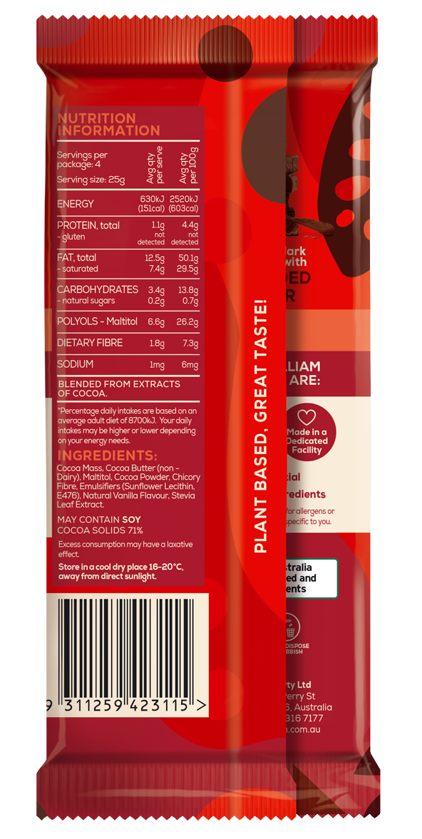 {"id":8910560952616,"title":"Sweet William Dark Chocolate (No Added Sugar) Bar 100g (cold)","handle":"sweet-william-dark-chocolate-no-added-sugar-100g","description":"\u003cp\u003e\u003cspan\u003eA unique, rich and creamy dark chocolate with a gentle touch of sweetness, this is a real crowd pleaser. It’s the dark chocolate for everyone and with No Added Sugar and all naturally sweetened with Stevia, you can indulge in more than a little.\u003c\/span\u003e\u003c\/p\u003e\n\u003c!-- TABS --\u003e\n\u003ch5\u003eReviews\u003c\/h5\u003e\n\u003cp\u003eReviews go here\u003c\/p\u003e\n\u003ch5\u003eIngredients\u003c\/h5\u003e\n\u003cp\u003eAny images, tags, filters, product categories, and any other information on this website showing ingredients, nutrition panels, or allergy statements are for guidance only, as manufacturers often change their formulations without notice. Please contact the manufacturer for the most up-to-date ingredient information, or email us to confirm the ingredients of the stock currently on hand.\u003c\/p\u003e\n\u003ch5\u003eImportant Shipping Note\u003c\/h5\u003e\n\u003cdiv\u003e\n\u003cspan\u003eAll orders containing chilled products, frozen products and chocolates must include a Cooler to protect them in transit. The\u003c\/span\u003e\u003cspan\u003e \u003c\/span\u003e\u003cspan\u003eCooler\u003c\/span\u003e\u003cspan\u003e will automatically add to your order when a cold product is added to your shopping cart. \u003c\/span\u003e\u003cspan\u003eFrozen items may defrost in transit, we can not recommend re-freezing. \u003c\/span\u003e\u003cspan\u003eWe will select the correct size cooler for your order. Chilled orders can only be sent to certain areas, please refer to our \u003c\/span\u003e\u003ca href=\"https:\/\/www.crueltyfreeshop.com.au\/pages\/faq#refrid\" rel=\"noopener\" data-saferedirecturl=\"https:\/\/www.google.com\/url?q=https:\/\/www.crueltyfreeshop.com.au\/pages\/faq%23refrid\u0026amp;source=gmail\u0026amp;ust=1664430462005000\u0026amp;usg=AOvVaw3YpBIvhTwoxQRA_PVqbP_L\" target=\"_blank\"\u003eFAQ\u003c\/a\u003e\u003cspan\u003e or email us at \u003c\/span\u003e\u003ca href=\"mailto:online@vegangrocerystore.com.au\" rel=\"noopener\" target=\"_blank\"\u003eonline@vegangrocerystore.\u003cwbr\u003ecom.au\u003c\/wbr\u003e\u003c\/a\u003e\n\u003c\/div\u003e\n\u003c!-- \/TABS --\u003e","published_at":"2024-02-23T11:36:22+11:00","created_at":"2024-02-23T11:36:23+11:00","vendor":"Sweet William","type":"Food","tags":["Baking","Chocolate","Sydney Store"],"price":1199,"price_min":1199,"price_max":1199,"available":true,"price_varies":false,"compare_at_price":null,"compare_at_price_min":0,"compare_at_price_max":0,"compare_at_price_varies":false,"variants":[{"id":47681961820456,"title":"Default Title","option1":"Default Title","option2":null,"option3":null,"sku":"9311259423115","requires_shipping":true,"taxable":true,"featured_image":null,"available":true,"name":"Sweet William Dark Chocolate (No Added Sugar) Bar 100g (cold)","public_title":null,"options":["Default Title"],"price":1199,"weight":100,"compare_at_price":null,"inventory_quantity":1,"inventory_management":"shopify","inventory_policy":"deny","barcode":null,"requires_selling_plan":false,"selling_plan_allocations":[]}],"images":["\/\/www.vegangrocerystore.com.au\/cdn\/shop\/files\/SWLM1030R.jpg?v=1764735746","\/\/www.vegangrocerystore.com.au\/cdn\/shop\/files\/DarkChocolate_NoAddedSugar_100gBack.png?v=1764735746"],"featured_image":"\/\/www.vegangrocerystore.com.au\/cdn\/shop\/files\/SWLM1030R.jpg?v=1764735746","options":["Title"],"media":[{"alt":null,"id":43122373329192,"position":1,"preview_image":{"aspect_ratio":1.0,"height":700,"width":700,"src":"\/\/www.vegangrocerystore.com.au\/cdn\/shop\/files\/SWLM1030R.jpg?v=1764735746"},"aspect_ratio":1.0,"height":700,"media_type":"image","src":"\/\/www.vegangrocerystore.com.au\/cdn\/shop\/files\/SWLM1030R.jpg?v=1764735746","width":700},{"alt":null,"id":37833397961000,"position":2,"preview_image":{"aspect_ratio":0.503,"height":1177,"width":592,"src":"\/\/www.vegangrocerystore.com.au\/cdn\/shop\/files\/DarkChocolate_NoAddedSugar_100gBack.png?v=1764735746"},"aspect_ratio":0.503,"height":1177,"media_type":"image","src":"\/\/www.vegangrocerystore.com.au\/cdn\/shop\/files\/DarkChocolate_NoAddedSugar_100gBack.png?v=1764735746","width":592}],"requires_selling_plan":false,"selling_plan_groups":[],"content":"\u003cp\u003e\u003cspan\u003eA unique, rich and creamy dark chocolate with a gentle touch of sweetness, this is a real crowd pleaser. It’s the dark chocolate for everyone and with No Added Sugar and all naturally sweetened with Stevia, you can indulge in more than a little.\u003c\/span\u003e\u003c\/p\u003e\n\u003c!-- TABS --\u003e\n\u003ch5\u003eReviews\u003c\/h5\u003e\n\u003cp\u003eReviews go here\u003c\/p\u003e\n\u003ch5\u003eIngredients\u003c\/h5\u003e\n\u003cp\u003eAny images, tags, filters, product categories, and any other information on this website showing ingredients, nutrition panels, or allergy statements are for guidance only, as manufacturers often change their formulations without notice. Please contact the manufacturer for the most up-to-date ingredient information, or email us to confirm the ingredients of the stock currently on hand.\u003c\/p\u003e\n\u003ch5\u003eImportant Shipping Note\u003c\/h5\u003e\n\u003cdiv\u003e\n\u003cspan\u003eAll orders containing chilled products, frozen products and chocolates must include a Cooler to protect them in transit. The\u003c\/span\u003e\u003cspan\u003e \u003c\/span\u003e\u003cspan\u003eCooler\u003c\/span\u003e\u003cspan\u003e will automatically add to your order when a cold product is added to your shopping cart. \u003c\/span\u003e\u003cspan\u003eFrozen items may defrost in transit, we can not recommend re-freezing. \u003c\/span\u003e\u003cspan\u003eWe will select the correct size cooler for your order. Chilled orders can only be sent to certain areas, please refer to our \u003c\/span\u003e\u003ca href=\"https:\/\/ww