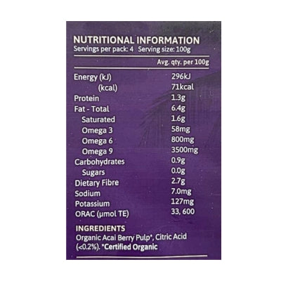 {"id":9701095375144,"title":"Amazonia Organic Acai Pure Smoothie 100g (cold)","handle":"tbdamazoniapureacaismoothiepack4x100g","description":"\u003cp\u003e\u003cspan\u003eDiscover the purest form of Amazonia açaí. With 7x the antioxidants of blueberries, these nutrient-dense packs are made from fresh, wild-harvested açaí, never reconstituted. Açaí Pure is the ultimate clean, antioxidant-rich base for smoothies and breakfast bowls.\u003c\/span\u003e\u003c\/p\u003e\n\u003ch5\u003eReviews\u003c\/h5\u003e\n\u003cp\u003eReviews go here\u003c\/p\u003e\n\u003ch5\u003eIngredients\u003c\/h5\u003e\n\u003cp\u003eAny images, tags, filters, product categories, and any other information on this website showing ingredients, nutrition panels, or allergy statements are for guidance only, as manufacturers often change their formulations without notice. Please contact the manufacturer for the most up-to-date ingredient information, or email us to confirm the ingredients of the stock currently on hand.\u003c\/p\u003e\n\u003ch5\u003eImportant Shipping Note\u003c\/h5\u003e\n\u003cdiv\u003e\n\u003cspan\u003eAll orders containing chilled products, frozen products and chocolates must include a Cooler to protect them in transit. The\u003c\/span\u003e\u003cspan\u003e \u003c\/span\u003e\u003cspan\u003eCooler\u003c\/span\u003e\u003cspan\u003e will automatically add to your order when a cold product is added to your shopping cart. \u003c\/span\u003e\u003cspan\u003eFrozen items may defrost in transit, we can not recommend re-freezing. \u003c\/span\u003e\u003cspan\u003eWe will select the correct size cooler for your order. Chilled orders can only be sent to certain areas, please refer to our \u003c\/span\u003e\u003ca href=\"https:\/\/www.crueltyfreeshop.com.au\/pages\/faq#refrid\" rel=\"noopener\" target=\"_blank\" data-saferedirecturl=\"https:\/\/www.google.com\/url?q=https:\/\/www.crueltyfreeshop.com.au\/pages\/faq%23refrid\u0026amp;source=gmail\u0026amp;ust=1664430462005000\u0026amp;usg=AOvVaw3YpBIvhTwoxQRA_PVqbP_L\"\u003eFAQ\u003c\/a\u003e\u003cspan\u003e or email us at \u003c\/span\u003e\u003ca href=\"mailto:online@vegangrocerystore.com.au\" rel=\"noopener\" target=\"_blank\"\u003eonline@vegangrocerystore.\u003cwbr\u003ecom.au\u003c\/wbr\u003e\u003c\/a\u003e\n\u003c\/div\u003e","published_at":"2025-09-23T19:12:47+10:00","created_at":"2025-07-09T10:05:20+10:00","vendor":"Amazonia","type":"Food (GST Free)","tags":["Health Food","Sydney Store"],"price":999,"price_min":999,"price_max":999,"available":true,"price_varies":false,"compare_at_price":null,"compare_at_price_min":0,"compare_at_price_max":0,"compare_at_price_varies":false,"variants":[{"id":50366202478888,"title":"Default Title","option1":"Default Title","option2":null,"option3":null,"sku":"9344060000008","requires_shipping":true,"taxable":false,"featured_image":null,"available":true,"name":"Amazonia Organic Acai Pure Smoothie 100g (cold)","public_title":null,"options":["Default Title"],"price":999,"weight":0,"compare_at_price":null,"inventory_quantity":6,"inventory_management":"shopify","inventory_policy":"deny","barcode":null,"requires_selling_plan":false,"selling_plan_allocations":[]}],"images":["\/\/www.vegangrocerystore.com.au\/cdn\/shop\/files\/AmazoniaOrganicAcaiPureSmoothie100g.png?v=1764732893","\/\/www.vegangrocerystore.com.au\/cdn\/shop\/files\/acai-NutritionalInfo.jpg?v=1764732893"],"featured_image":"\/\/www.vegangrocerystore.com.au\/cdn\/shop\/files\/AmazoniaOrganicAcaiPureSmoothie100g.png?v=1764732893","options":["Title"],"media":[{"alt":null,"id":43121879122216,"position":1,"preview_image":{"aspect_ratio":1.0,"height":800,"width":800,"src":"\/\/www.vegangrocerystore.com.au\/cdn\/shop\/files\/AmazoniaOrganicAcaiPureSmoothie100g.png?v=1764732893"},"aspect_ratio":1.0,"height":800,"media_type":"image","src":"\/\/www.vegangrocerystore.com.au\/cdn\/shop\/files\/AmazoniaOrganicAcaiPureSmoothie100g.png?v=1764732893","width":800},{"alt":null,"id":43015717814568,"position":2,"preview_image":{"aspect_ratio":1.0,"height":400,"width":400,"src":"\/\/www.vegangrocerystore.com.au\/cdn\/shop\/files\/acai-NutritionalInfo.jpg?v=1764732893"},"aspect_ratio":1.0,"height":400,"media_type":"image","src":"\/\/www.vegangrocerystore.com.au\/cdn\/shop\/files\/acai-NutritionalInfo.jpg?v=1764732893","width":400}],"requires_selling_plan":false,"selling_plan_groups":[],"content":"\u003cp\u003e\u003cspan\u003eDiscover the purest form of Amazonia açaí. With 7x the antioxidants of blueberries, these nutrient-dense packs are made from fresh, wild-harvested açaí, never reconstituted. Açaí Pure is the ultimate clean, antioxidant-rich base for smoothies and breakfast bowls.\u003c\/span\u003e\u003c\/p\u003e\n\u003ch5\u003eReviews\u003c\/h5\u003e\n\u003cp\u003eReviews go here\u003c\/p\u003e\n\u003ch5\u003eIngredients\u003c\/h5\u003e\n\u003cp\u003eAny images, tags, filters, product categories, and any other information on this website showing ingredients, nutrition panels, or allergy statements are for guidance only, as manufacturers often change their formulations without notice. Please contact the manufacturer for the most up-to-date ingredient information, or email us to confirm the ingredients of the stock currently on hand.\u003c\/p\u003e\n\u003ch5\u003eImportant Shipping Note\u003c\/h5\u003e\n\u003cdiv\u003e\n\u003cspan\u003eAll orders containing chilled products, frozen products and chocolates must include a Cooler to protect them in transit. The\u003c\/span\u003e\u003cspan\u003e \u003c\/span\u003e\u003cspan\u003eCooler\u003c\/span\u003e\u003cspan\u003e will automatically add to your order when a cold product is added to your shopping cart. \u003c\/span\u003e\u003cspan\u003eFrozen items may defrost in transit, we can not recommend re-freezing. \u003c\/span\u003e\u003cspan\u003eWe will select the correct size cooler for your order. Chilled orders can only be sent to certain areas, please refer to our \u003c\/span\u003e\u003ca href=\"https:\/\/www.crueltyfreeshop.com.au\