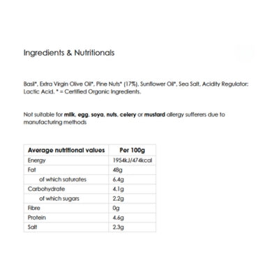 {"id":9802708123944,"title":"Biona Green Pesto 120g","handle":"tbdbionagreenpesto120g","description":"\u003cp\u003eMamma mia! Every kitchen needs this-a pesto. Super tasty organic green pesto, made with pine kernels, is perfect added to pasta or as a bruschetta spread onto bread. With no added parmesan cheese, this pesto is perfecto for vegans too.\u003c\/p\u003e\n\u003cp\u003eBiona Organic believe in great tasting, thoughtfully prepared food to complement a healthy and ethical lifestyle. Their farmers and producers don't use chemical pesticides or herbicides, they don't grow genetically modified plants or use nasty preservatives and additives. \u003cbr\u003e\u003cbr\u003eBiona also make sure they only use sustainable farming methods and do not work their land intensively. And because they believe in 100% traceability, Biona know where all their ingredients come from, that they are of the highest quality and taste, completely natural.\u003c\/p\u003e\n\u003ch5\u003eReviews\u003c\/h5\u003e\n\u003cp\u003eReviews go here\u003c\/p\u003e\n\u003ch5\u003eIngredients\u003c\/h5\u003e\n\u003cp\u003eAny images, tags, filters, product categories, and any other information on this website showing ingredients, nutrition panels, or allergy statements are for guidance only, as manufacturers often change their formulations without notice. Please contact the manufacturer for the most up-to-date ingredient information, or email us to confirm the ingredients of the stock currently on hand.\u003c\/p\u003e","published_at":"2025-09-15T16:16:31+10:00","created_at":"2025-09-15T16:16:30+10:00","vendor":"Biona","type":"Food (GST Free)","tags":["Pesto","Sydney Store"],"price":1291,"price_min":1291,"price_max":1291,"available":true,"price_varies":false,"compare_at_price":null,"compare_at_price_min":0,"compare_at_price_max":0,"compare_at_price_varies":false,"variants":[{"id":50644399554856,"title":"Default Title","option1":"Default Title","option2":null,"option3":null,"sku":"5032722302075","requires_shipping":true,"taxable":false,"featured_image":null,"available":true,"name":"Biona Green Pesto 120g","public_title":null,"options":["Default Title"],"price":1291,"weight":120,"compare_at_price":null,"inventory_quantity":2,"inventory_management":"shopify","inventory_policy":"deny","barcode":null,"requires_selling_plan":false,"selling_plan_allocations":[]}],"images":["\/\/www.vegangrocerystore.com.au\/cdn\/shop\/files\/BionaGreenPesto120g.png?v=1763791303","\/\/www.vegangrocerystore.com.au\/cdn\/shop\/files\/BionaPesto-NutritionalInformation.jpg?v=1764804547"],"featured_image":"\/\/www.vegangrocerystore.com.au\/cdn\/shop\/files\/BionaGreenPesto120g.png?v=1763791303","options":["Title"],"media":[{"alt":null,"id":43028771635496,"position":1,"preview_image":{"aspect_ratio":1.0,"height":400,"width":400,"src":"\/\/www.vegangrocerystore.com.au\/cdn\/shop\/files\/BionaGreenPesto120g.png?v=1763791303"},"aspect_ratio":1.0,"height":400,"media_type":"image","src":"\/\/www.vegangrocerystore.com.au\/cdn\/shop\/files\/BionaGreenPesto120g.png?v=1763791303","width":400},{"alt":null,"id":43126980182312,"position":2,"preview_image":{"aspect_ratio":1.0,"height":400,"width":400,"src":"\/\/www.vegangrocerystore.com.au\/cdn\/shop\/files\/BionaPesto-NutritionalInformation.jpg?v=1764804547"},"aspect_ratio":1.0,"height":400,"media_type":"image","src":"\/\/www.vegangrocerystore.com.au\/cdn\/shop\/files\/BionaPesto-NutritionalInformation.jpg?v=1764804547","width":400}],"requires_selling_plan":false,"selling_plan_groups":[],"content":"\u003cp\u003eMamma mia! Every kitchen needs this-a pesto. Super tasty organic green pesto, made with pine kernels, is perfect added to pasta or as a bruschetta spread onto bread. With no added parmesan cheese, this pesto is perfecto for vegans too.\u003c\/p\u003e\n\u003cp\u003eBiona Organic believe in great tasting, thoughtfully prepared food to complement a healthy and ethical lifestyle. Their farmers and producers don't use chemical pesticides or herbicides, they don't grow genetically modified plants or use nasty preservatives and additives. \u003cbr\u003e\u003cbr\u003eBiona also make sure they only use sustainable farming methods and do not work their land intensively. And because they believe in 100% traceability, Biona know where all their ingredients come from, that they are of the highest quality and taste, completely natural.\u003c\/p\u003e\n\u003ch5\u003eReviews\u003c\/h5\u003e\n\u003cp\u003eReviews go here\u003c\/p\u003e\n\u003ch5\u003eIngredients\u003c\/h5\u003e\n\u003cp\u003eAny images, tags, filters, product categories, and any other information on this website showing ingredients, nutrition panels, or allergy statements are for guidance only, as manufacturers often change their formulations without notice. Please contact the manufacturer for the most up-to-date ingredient information, or email us to confirm the ingredients of the stock currently on hand.\u003c\/p\u003e"}