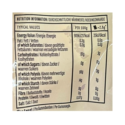 100g. Ingredients: Sweetner: Maltitol syrup; maize starch, water, acid: citric acid; natural flavorings, vegetable oil (coconut and rapeseed), glazing agent: carnauba wax; colors: lutein, black carrot juice concentrate, spirulina concentrate, safflower extract; sweetener.