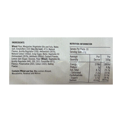 200g. Ingredients: Wheat Flour, Vegetable Margarine (Vegetable Fats & Oils, Water, Salt, Emulsifiers322 [Soy-Derived], 471), Natural Flavour, Acidity Regulator (330), Natural Colour(160a), Antioxidant (307b [Soy-Derived]), Icing Sugar, Water, Vegetable Oil (ContainsSunflower Oil, Antioxidant (307), Antifoam (900a)), Shortening (Vegetable Oil,Emulsifiers (435, 471), Antioxidant (307b)),Lemon Flavour (Natural Flavour, NaturalColour (Gardenia Extract), Thickener (E145), Preservative (E202, E330))