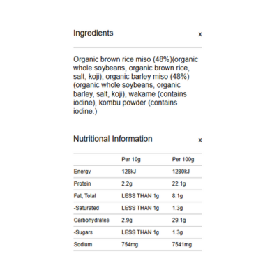 35ml. 5 sachets. Ingredients: White miso powder (76%), tapioca syrup, sea salt, Wakame sea vegetable (contains iodine), Long green onion, Onion powder, Kombu sea vegetable powder (contains iodine), Shiitake mushroom extract, Yeast extract.
