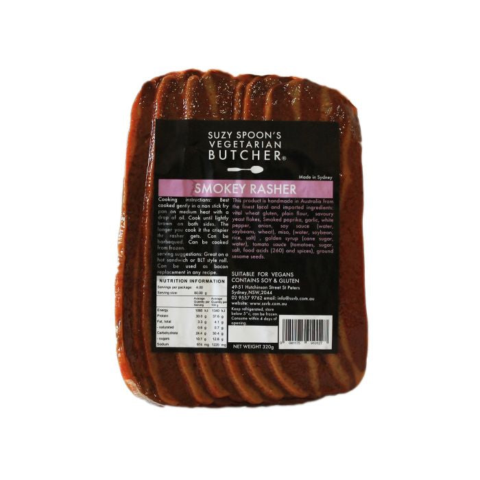 {"id":9848479023400,"title":"Suzy Spoons Smokey Rashers -320g (cold)","handle":"tbdsuzyspoonssmokeyrashers-320gcold","description":"\u003cp\u003e7 Slices per pack\u003c\/p\u003e\n\u003cp\u003eThese Smokey Rashers are great on a hot sandwich or BLT style roll, add to your favourite pasta dish, pies or just cook up for breakfast. Can be used as bacon replacement in any recipe.\u003c\/p\u003e\n\u003ch5\u003eReviews\u003c\/h5\u003e\n\u003cp\u003eReviews go here\u003c\/p\u003e\n\u003ch5\u003eIngredients\u003c\/h5\u003e\n\u003cp\u003eAny images, tags, filters, product categories, and any other information on this website showing ingredients, nutrition panels, or allergy statements are for guidance only, as manufacturers often change their formulations without notice. Please contact the manufacturer for the most up-to-date ingredient information, or email us to confirm the ingredients of the stock currently on hand.\u003c\/p\u003e\n\u003ch5\u003eImportant Shipping Note\u003c\/h5\u003e\n\u003cdiv\u003e\n\u003cspan\u003eAll orders containing chilled products, frozen products and chocolates must include a Cooler to protect them in transit. The\u003c\/span\u003e\u003cspan\u003e \u003c\/span\u003e\u003cspan\u003eCooler\u003c\/span\u003e\u003cspan\u003e will automatically add to your order when a cold product is added to your shopping cart. \u003c\/span\u003e\u003cspan\u003eFrozen items may defrost in transit, we can not recommend re-freezing. \u003c\/span\u003e\u003cspan\u003eWe will select the correct size cooler for your order. Chilled orders can only be sent to certain areas, please refer to our \u003c\/span\u003e\u003ca href=\"https:\/\/www.crueltyfreeshop.com.au\/pages\/faq#refrid\" rel=\"noopener\" target=\"_blank\" data-saferedirecturl=\"https:\/\/www.google.com\/url?q=https:\/\/www.crueltyfreeshop.com.au\/pages\/faq%23refrid\u0026amp;source=gmail\u0026amp;ust=1664430462005000\u0026amp;usg=AOvVaw3YpBIvhTwoxQRA_PVqbP_L\"\u003eFAQ\u003c\/a\u003e\u003cspan\u003e or email us at \u003c\/span\u003e\u003ca href=\"mailto:online@vegangrocerystore.com.au\" rel=\"noopener\" target=\"_blank\"\u003eonline@vegangrocerystore.\u003cwbr\u003ecom.au\u003c\/wbr\u003e\u003c\/a\u003e\n\u003c\/div\u003e","published_at":"2026-02-06T12:25:24+11:00","created_at":"2025-10-13T13:54:53+11:00","vendor":"Suzy Spoons","type":"Refrig food (GST Free)","tags":["Bacon","Sydney Store"],"price":1435,"price_min":1435,"price_max":1435,"available":true,"price_varies":false,"compare_at_price":null,"compare_at_price_min":0,"compare_at_price_max":0,"compare_at_price_varies":false,"variants":[{"id":50826292855080,"title":"Default Title","option1":"Default Title","option2":null,"option3":null,"sku":"081175910127","requires_shipping":true,"taxable":false,"featured_image":null,"available":true,"name":"Suzy Spoons Smokey Rashers -320g (cold)","public_title":null,"options":["Default Title"],"price":1435,"weight":320,"compare_at_price":null,"inventory_quantity":5,"inventory_management":"shopify","inventory_policy":"deny","barcode":null,"requires_selling_plan":false,"selling_plan_allocations":[]}],"images":["\/\/www.vegangrocerystore.com.au\/cdn\/shop\/files\/SZSP1100R.jpg?v=1765854666"],"featured_image":"\/\/www.vegangrocerystore.com.au\/cdn\/shop\/files\/SZSP1100R.jpg?v=1765854666","options":["Title"],"media":[{"alt":null,"id":43185920016680,"position":1,"preview_image":{"aspect_ratio":1.0,"height":700,"width":700,"src":"\/\/www.vegangrocerystore.com.au\/cdn\/shop\/files\/SZSP1100R.jpg?v=1765854666"},"aspect_ratio":1.0,"height":700,"media_type":"image","src":"\/\/www.vegangrocerystore.com.au\/cdn\/shop\/files\/SZSP1100R.jpg?v=1765854666","width":700}],"requires_selling_plan":false,"selling_plan_groups":[],"content":"\u003cp\u003e7 Slices per pack\u003c\/p\u003e\n\u003cp\u003eThese Smokey Rashers are great on a hot sandwich or BLT style roll, add to your favourite pasta dish, pies or just cook up for breakfast. Can be used as bacon replacement in any recipe.\u003c\/p\u003e\n\u003ch5\u003eReviews\u003c\/h5\u003e\n\u003cp\u003eReviews go here\u003c\/p\u003e\n\u003ch5\u003eIngredients\u003c\/h5\u003e\n\u003cp\u003eAny images, tags, filters, product categories, and any other information on this website showing ingredients, nutrition panels, or allergy statements are for guidance only, as manufacturers often change their formulations without notice. Please contact the manufacturer for the most up-to-date ingredient information, or email us to confirm the ingredients of the stock currently on hand.\u003c\/p\u003e\n\u003ch5\u003eImportant Shipping Note\u003c\/h5\u003e\n\u003cdiv\u003e\n\u003cspan\u003eAll orders containing chilled products, frozen products and chocolates must include a Cooler to protect them in transit. The\u003c\/span\u003e\u003cspan\u003e \u003c\/span\u003e\u003cspan\u003eCooler\u003c\/span\u003e\u003cspan\u003e will automatically add to your order when a cold product is added to your shopping cart. \u003c\/span\u003e\u003cspan\u003eFrozen items may defrost in transit, we can not recommend re-freezing. \u003c\/span\u003e\u003cspan\u003eWe will select the correct size cooler for your order. Chilled orders can only be sent to certain areas, please refer to our \u003c\/span\u003e\u003ca href=\"https:\/\/www.crueltyfreeshop.com.au\/pages\/faq#refrid\" rel=\"noopener\" target=\"_blank\" data-saferedirecturl=\"https:\/\/www.google.com\/url?q=https:\/\/www.crueltyfreeshop.com.au\/pages\/faq%23refrid\u0026amp;source=gmail\u0026amp;ust=1664430462005000\u0026amp;usg=AOvVaw3YpBIvhTwoxQRA_PVqbP_L\"\u003eFAQ\u003c\/a\u003e\u003cspan\u003e or email us at \u003c\/span\u003e\u003ca href=\"mailto:online@vegangrocerystore.com.au\" rel=\"noopener\" target=\"_blank\"\u003eonline@vegangrocerystore.\u003cwbr\u003ecom.au\u003c\/wbr\u003e\u003c\/a\u003e\n\u003c\/div\u003e"}