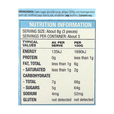 {"id":10152481980712,"title":"The Ginger People Gin Gins Ginger Candy - Super Strength 31g","handle":"the-ginger-people-gin-gins-ginger-candy-super-strength-31g","description":"\u003cp class=\"product-heading__introduction\"\u003eFondly referred to as our “little potion for the motion,” Gin Gins® Super Strong Candy is one of our most potent ginger candies — super-delicious and super-soothing. You’ll enjoy its unique, caramel-like texture that softens its warm ginger kick.\u003c\/p\u003e\n\u003cdiv class=\"product-bullets\"\u003e\n\u003cul\u003e\n\u003cli\u003eMade with 30% fresh ginger – more than any other brand\u003c\/li\u003e\n\u003cli\u003eGreat for travel and nausea-related conditions\u003c\/li\u003e\n\u003cli\u003eAdd 5-6 pieces to a cup of boiling water – instant ginger tea!\u003c\/li\u003e\n\u003cli\u003eNon-GMO | Gluten Free | Vegan\u003c\/li\u003e\n\u003cli\u003eWorld’s #1 selling ginger candy\u003c\/li\u003e\n\u003cli\u003eNo artificial sweeteners or sugar alcohols\u003c\/li\u003e\n\u003cli\u003eSustainably farmed ginger and palm oil\u003c\/li\u003e\n\u003c\/ul\u003e\n\u003c\/div\u003e\n\u003ch5\u003eReviews\u003c\/h5\u003e\n\u003cp\u003eReviews go here\u003c\/p\u003e\n\u003ch5\u003eIngredients\u003c\/h5\u003e\n\u003cp\u003eAny images, tags, filters, product categories, and any other information on this website showing ingredients, nutrition panels, or allergy statements are for guidance only, as manufacturers often change their formulations without notice. Please contact the manufacturer for the most up-to-date ingredient information, or email us to confirm the ingredients of the stock currently on hand.\u003c\/p\u003e","published_at":"2026-02-13T15:22:45+11:00","created_at":"2026-02-13T15:22:44+11:00","vendor":"The Ginger People","type":"","tags":["Sweets","Sydney Store","Travel"],"price":310,"price_min":310,"price_max":310,"available":true,"price_varies":false,"compare_at_price":null,"compare_at_price_min":0,"compare_at_price_max":0,"compare_at_price_varies":false,"variants":[{"id":51426418393384,"title":"Default Title","option1":"Default Title","option2":null,"option3":null,"sku":"734027981126","requires_shipping":true,"taxable":true,"featured_image":null,"available":true,"name":"The Ginger People Gin Gins Ginger Candy - Super Strength 31g","public_title":null,"options":["Default Title"],"price":310,"weight":31,"compare_at_price":null,"inventory_quantity":10,"inventory_management":"shopify","inventory_policy":"deny","barcode":null,"requires_selling_plan":false,"selling_plan_allocations":[]}],"images":["\/\/www.vegangrocerystore.com.au\/cdn\/shop\/files\/Gin-Gin-Ginger-Candy-Extra-Strength.png?v=1770956567","\/\/www.vegangrocerystore.com.au\/cdn\/shop\/files\/GinGins-NutritionalInformation.jpg?v=1771393852"],"featured_image":"\/\/www.vegangrocerystore.com.au\/cdn\/shop\/files\/Gin-Gin-Ginger-Candy-Extra-Strength.png?v=1770956567","options":["Title"],"media":[{"alt":null,"id":43466806657320,"position":1,"preview_image":{"aspect_ratio":1.0,"height":400,"width":400,"src":"\/\/www.vegangrocerystore.com.au\/cdn\/shop\/files\/Gin-Gin-Ginger-Candy-Extra-Strength.png?v=1770956567"},"aspect_ratio":1.0,"height":400,"media_type":"image","src":"\/\/www.vegangrocerystore.com.au\/cdn\/shop\/files\/Gin-Gin-Ginger-Candy-Extra-Strength.png?v=1770956567","width":400},{"alt":null,"id":43503308505384,"position":2,"preview_image":{"aspect_ratio":1.0,"height":400,"width":400,"src":"\/\/www.vegangrocerystore.com.au\/cdn\/shop\/files\/GinGins-NutritionalInformation.jpg?v=1771393852"},"aspect_ratio":1.0,"height":400,"media_type":"image","src":"\/\/www.vegangrocerystore.com.au\/cdn\/shop\/files\/GinGins-NutritionalInformation.jpg?v=1771393852","width":400}],"requires_selling_plan":false,"selling_plan_groups":[],"content":"\u003cp class=\"product-heading__introduction\"\u003eFondly referred to as our “little potion for the motion,” Gin Gins® Super Strong Candy is one of our most potent ginger candies — super-delicious and super-soothing. You’ll enjoy its unique, caramel-like texture that softens its warm ginger kick.\u003c\/p\u003e\n\u003cdiv class=\"product-bullets\"\u003e\n\u003cul\u003e\n\u003cli\u003eMade with 30% fresh ginger – more than any other brand\u003c\/li\u003e\n\u003cli\u003eGreat for travel and nausea-related conditions\u003c\/li\u003e\n\u003cli\u003eAdd 5-6 pieces to a cup of boiling water – instant ginger tea!\u003c\/li\u003e\n\u003cli\u003eNon-GMO | Gluten Free | Vegan\u003c\/li\u003e\n\u003cli\u003eWorld’s #1 selling ginger candy\u003c\/li\u003e\n\u003cli\u003eNo artificial sweeteners or sugar alcohols\u003c\/li\u003e\n\u003cli\u003eSustainably farmed ginger and palm oil\u003c\/li\u003e\n\u003c\/ul\u003e\n\u003c\/div\u003e\n\u003ch5\u003eReviews\u003c\/h5\u003e\n\u003cp\u003eReviews go here\u003c\/p\u003e\n\u003ch5\u003eIngredients\u003c\/h5\u003e\n\u003cp\u003eAny images, tags, filters, product categories, and any other information on this website showing ingredients, nutrition panels, or allergy statements are for guidance only, as manufacturers often change their formulations without notice. Please contact the manufacturer for the most up-to-date ingredient information, or email us to confirm the ingredients of the stock currently on hand.\u003c\/p\u003e"}