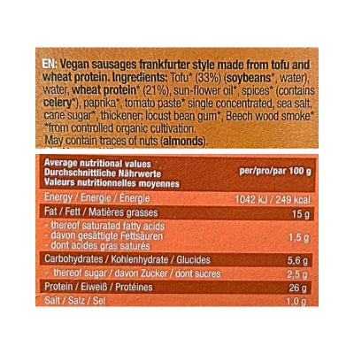 {"id":8353409499432,"title":"Tofutown Vegan Smoked Frankfurters 275g","handle":"tofutown-viana-organic-smoked-vegan-frankfurters-275g-case-6","description":"\u003cp\u003eThese large and hearty Viana Jumbos are ideal grill sausages. Thanks to tofu and wheat protein they combine hearty enjoyment with vitality and wellbeing.\u003c\/p\u003e\n\u003c!-- TABS --\u003e\n\u003ch5\u003eb\u003c\/h5\u003e\n\u003ch5\u003eReviews\u003c\/h5\u003e\n\u003cp\u003eReviews go here\u003c\/p\u003e\n\u003ch5\u003eIngredients\u003c\/h5\u003e\n\u003cp\u003eAny images, tags, filters, product categories, and any other information on this website showing ingredients, nutrition panels, or allergy statements are for guidance only, as manufacturers often change their formulations without notice. Please contact the manufacturer for the most up-to-date ingredient information, or email us to confirm the ingredients of the stock currently on hand.\u003c\/p\u003e\n\u003c!-- \/TABS --\u003e","published_at":"2024-12-19T13:27:07+11:00","created_at":"2023-06-27T12:19:06+10:00","vendor":"Tofutown","type":"Food (GST Free)","tags":["Beef","Sausages","Sydney Store"],"price":1180,"price_min":1180,"price_max":1180,"available":true,"price_varies":false,"compare_at_price":null,"compare_at_price_min":0,"compare_at_price_max":0,"compare_at_price_varies":false,"variants":[{"id":45416006713640,"title":"Default Title","option1":"Default Title","option2":null,"option3":null,"sku":"04019738192105","requires_shipping":true,"taxable":false,"featured_image":null,"available":true,"name":"Tofutown Vegan Smoked Frankfurters 275g","public_title":null,"options":["Default Title"],"price":1180,"weight":275,"compare_at_price":null,"inventory_quantity":14,"inventory_management":"shopify","inventory_policy":"deny","barcode":"","requires_selling_plan":false,"selling_plan_allocations":[]}],"images":["\/\/www.vegangrocerystore.com.au\/cdn\/shop\/files\/TFTW1040R.jpg?v=1763782727","\/\/www.vegangrocerystore.com.au\/cdn\/shop\/files\/TofuTownFrankfurters-NutritionalInformation.jpg?v=1764729161"],"featured_image":"\/\/www.vegangrocerystore.com.au\/cdn\/shop\/files\/TFTW1040R.jpg?v=1763782727","options":["Title"],"media":[{"alt":null,"id":43028170932520,"position":1,"preview_image":{"aspect_ratio":1.0,"height":700,"width":700,"src":"\/\/www.vegangrocerystore.com.au\/cdn\/shop\/files\/TFTW1040R.jpg?v=1763782727"},"aspect_ratio":1.0,"height":700,"media_type":"image","src":"\/\/www.vegangrocerystore.com.au\/cdn\/shop\/files\/TFTW1040R.jpg?v=1763782727","width":700},{"alt":null,"id":43121757946152,"position":2,"preview_image":{"aspect_ratio":1.0,"height":400,"width":400,"src":"\/\/www.vegangrocerystore.com.au\/cdn\/shop\/files\/TofuTownFrankfurters-NutritionalInformation.jpg?v=1764729161"},"aspect_ratio":1.0,"height":400,"media_type":"image","src":"\/\/www.vegangrocerystore.com.au\/cdn\/shop\/files\/TofuTownFrankfurters-NutritionalInformation.jpg?v=1764729161","width":400}],"requires_selling_plan":false,"selling_plan_groups":[],"content":"\u003cp\u003eThese large and hearty Viana Jumbos are ideal grill sausages. Thanks to tofu and wheat protein they combine hearty enjoyment with vitality and wellbeing.\u003c\/p\u003e\n\u003c!-- TABS --\u003e\n\u003ch5\u003eb\u003c\/h5\u003e\n\u003ch5\u003eReviews\u003c\/h5\u003e\n\u003cp\u003eReviews go here\u003c\/p\u003e\n\u003ch5\u003eIngredients\u003c\/h5\u003e\n\u003cp\u003eAny images, tags, filters, product categories, and any other information on this website showing ingredients, nutrition panels, or allergy statements are for guidance only, as manufacturers often change their formulations without notice. Please contact the manufacturer for the most up-to-date ingredient information, or email us to confirm the ingredients of the stock currently on hand.\u003c\/p\u003e\n\u003c!-- \/TABS --\u003e"}