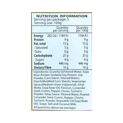 Ingredients: filtered water, soya bean protein, starch, vegetable oil, sugar, salt, vegetarian spices.